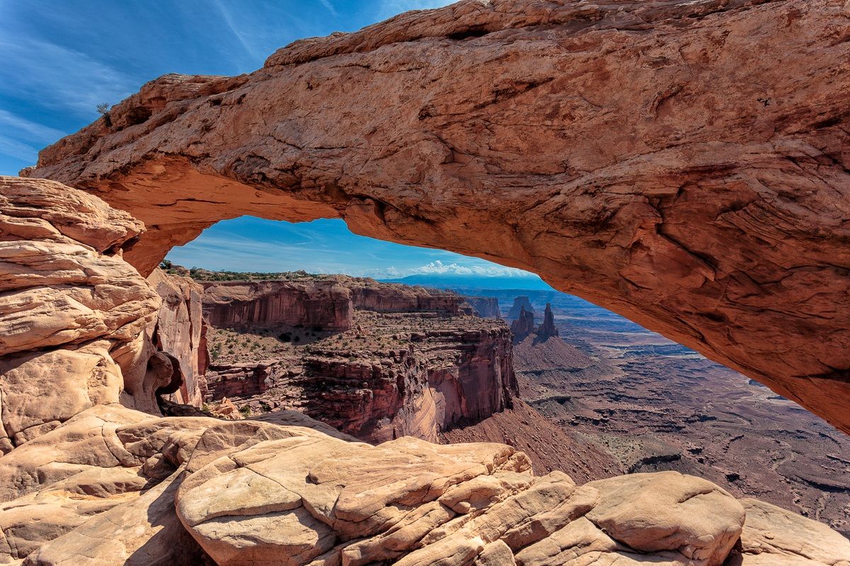Il secondo parco per importanza nelle vicinanze di Moab è il Canyonlands National Park. Gli artefici di questo aspro e selvaggio susseguirsi di canyon sono il lento scorrere dell'acqua e la forza di gravità. I quattro distretti del parco sono attraversati dai fiumi Green e Colorado, che formano una grande Y. Anche se appaiono vicini sulla mappa, non esistono strade che collegano direttamente i distretti e muoversi tra essi richiede molte ore di guida perché ci sono pochi posti per attraversare i fiumi. Island in the Sky è facilmente raggiungibile ed offre viste mozzafiato sui canyons; è come osservarli dal finestrino di un aereo perché lo sguardo spazia per decine di chilometri. In questa area si può ammirare il Mesa Arch, un grande arco sospeso sul vuoto.