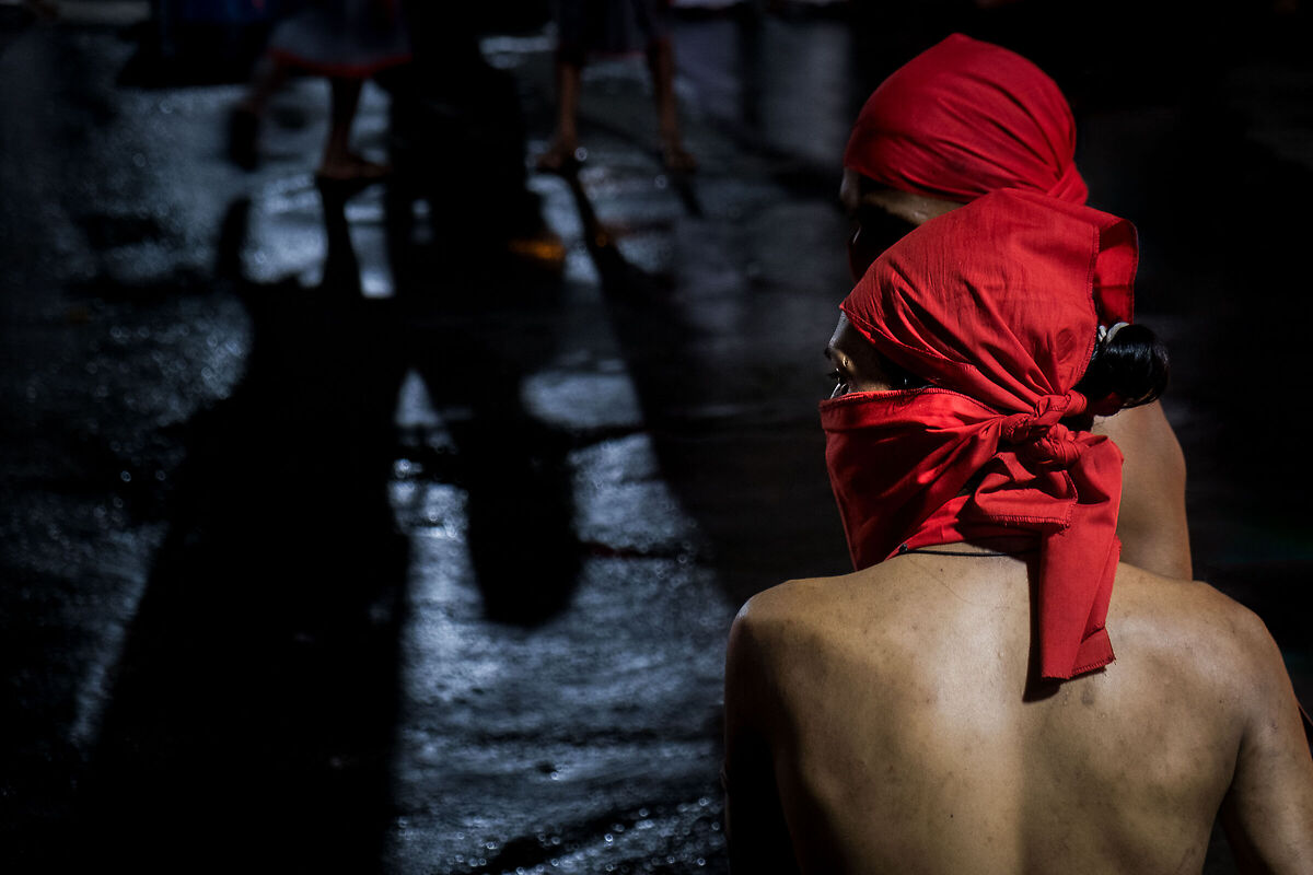 Arrivano degli uomini a torso nudo con il capo coperto da una fascia rossa che lascia intravedere solo gli occhi scuri mentre la musica si fa sempre più vicina.
