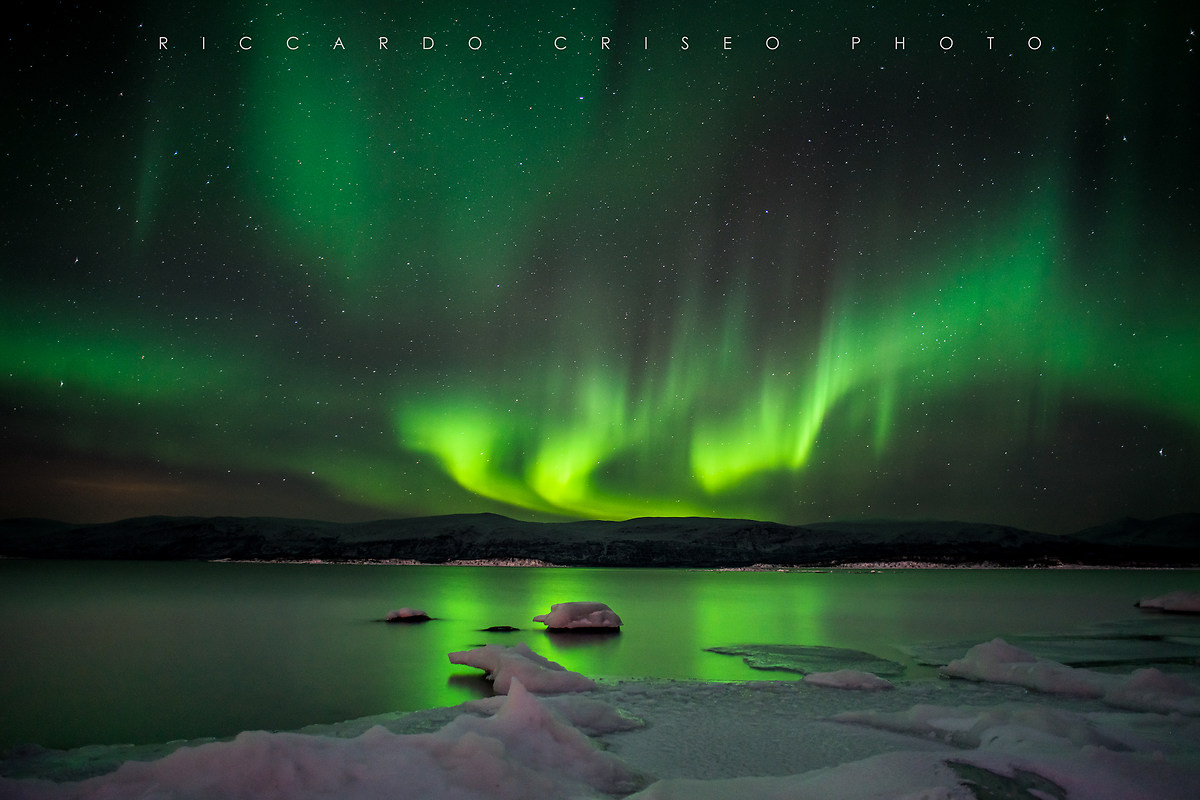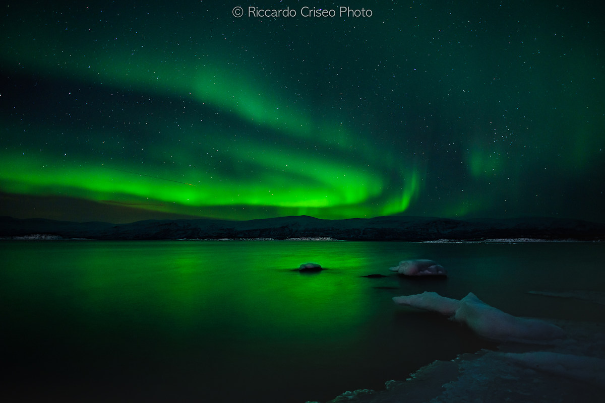 Tutto è perfetto. La temperatura è di -16 gradi, favorevolissima. Umidità nulla. Il cielo è terso, tutto è completamente tinto di un verde acceso. Sono sulla riva di un lago, ho tutto ciò che mi serve per comporre uno scatto, così come lo avevo immaginato.