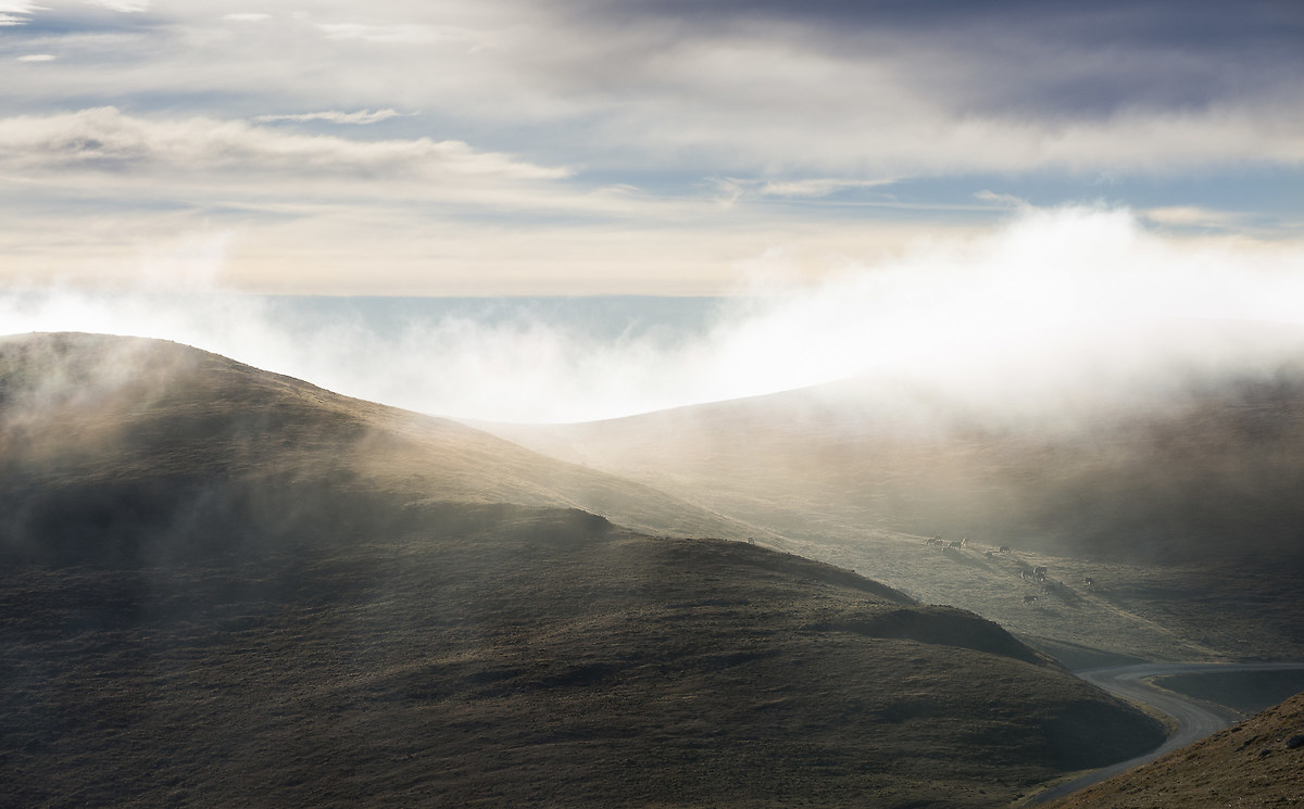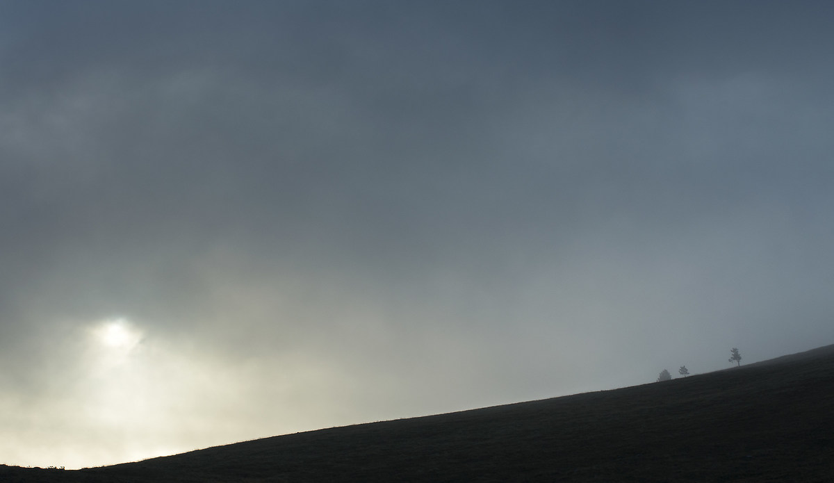 Leggero è davvero la parola giusta per esprimere il mio stato d'animo nel momento in cui assisto, insieme alla mia fidanzata, ad un'alba dorata fra queste "onde verdi", avvolti tra banchi di nebbia che passano proprio sopra la nostra testa e che riusciamo quasi a toccare con un dito. Scorrono veloci invorticandosi maldestramente su loro stesse, creando dei suggestivi giochi di ombre e luci, risucchiando e rigettando di continuo quei pochi dettagli sparsi a caso sui pendii.
