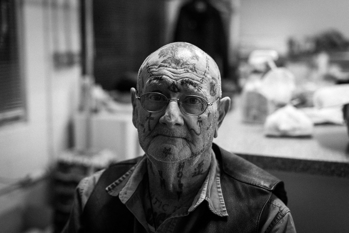 Per tutto il giorno successivo ho pensato a quell'uomo e ho deciso che dovevo avere una sua foto, così alla seconda sera entro nella lavanderia lasciando la moglie in macchina. Come metto un piede dentro, la donna con lui, mi dice che sono chiusi, io dico di non essere interessato a fare una lavatrice ma che vorrei fare qualche foto a loro. La signora dice subito di no allontanandosi e mi lascia solo con lui. Ecco sono morto penso io. Inizio a chiacchierare con lui. Un individuo strano, magnetico, che risponde a tutte le mie domande, ma a mono sillabi. Scopro dunque che si chiama Chinaman, il perché? “Bhè me lo sono tatuato sulla testa” dice lui, ok meglio non insistere. Ho scoperto dove ha fatto questi tatuaggi e cosa significano e me ne vado con qualche fotografia e sentendomi un fesso di aver avuto paura di un uomo che si è invece dimostrato dolcissimo.
