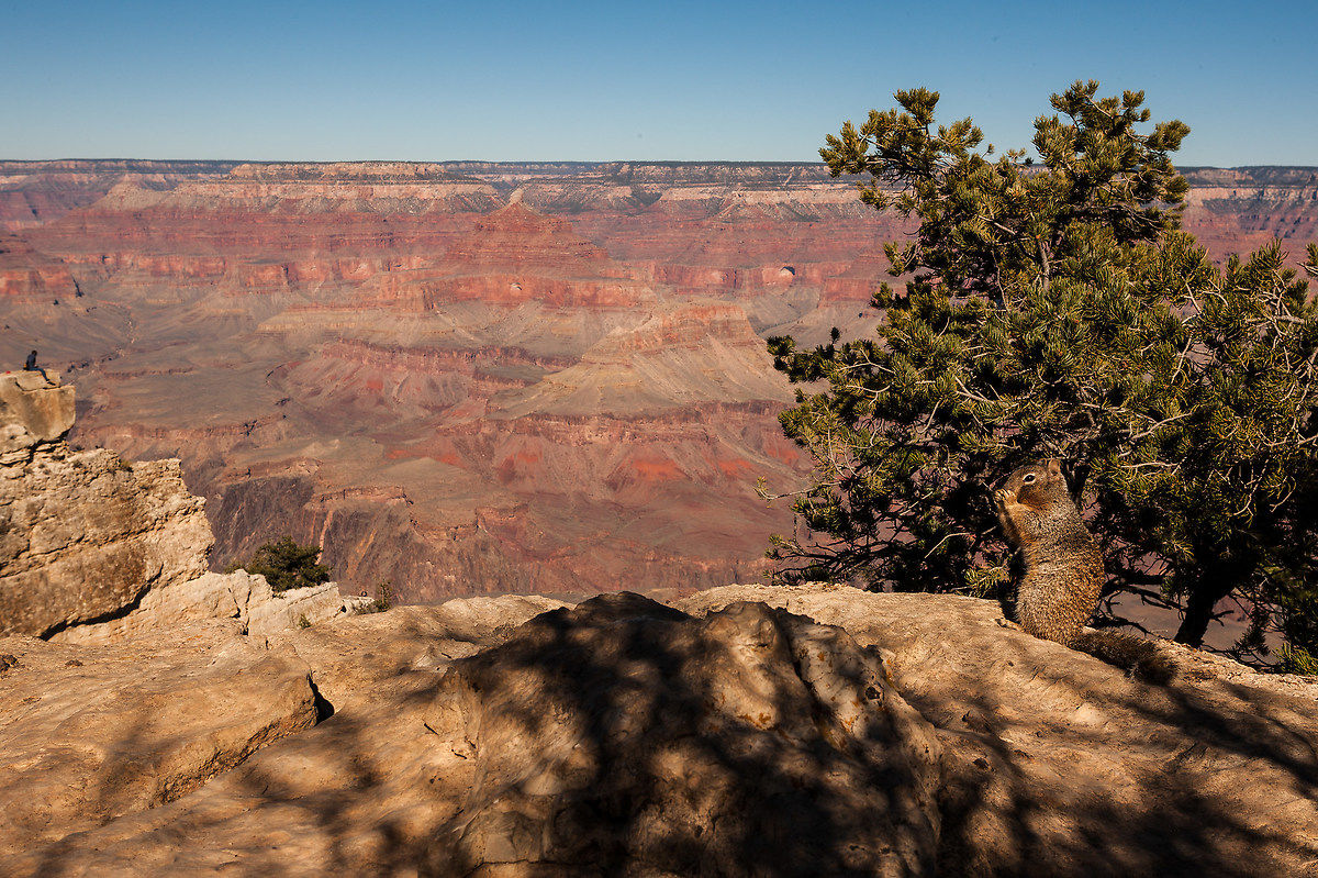Il secondo giorno di permanenza al canyon si svolge più o meno come il primo, camminiamo e cerchiamo di vedere quante più cose possibili, allontanandosi dal village centrale verso ovest, diventa ancora più bello, molta meno gente, il percorso è quasi tutto sterrato e gli animali estremamente confidenti. Cervi e Elk (un altro tipo di cervo) sono praticamente ovunque, questo è un parco e nessuno li tocca, l'unico predatore naturale che hanno è il puma, ma evita le zone battute dalle persone, quindi questi grossi erbivori se ne vivono in santa pace a contatto con gli umani. Ci infiliamo nel sentiero Bright Angel che conduce fino al fondo del canyon (in 9 ore), serve però un permesso per raggiungerlo in quanto il pernottamento a valle è d'obbligo. Non è una camminata da tutti, stiamo parlando di circa 1300 metri di dislivello in 9 ore, con una differenza di 15-20 gradi di temperatura, buio assoluto la notte e nessuna fonte d'acqua. Decidiamo di farne ovviamente solo un pezzetto e dopo poco più di un'ora di discesa ci rendiamo conto essere arrivati solo all'inizio della seconda striscia bianca di roccia dall'alto, la piattaforma del Coconino.
