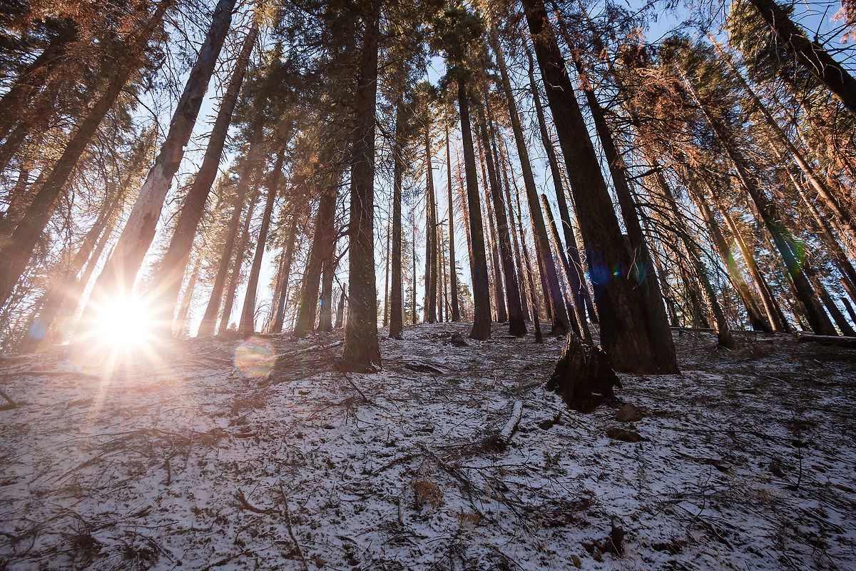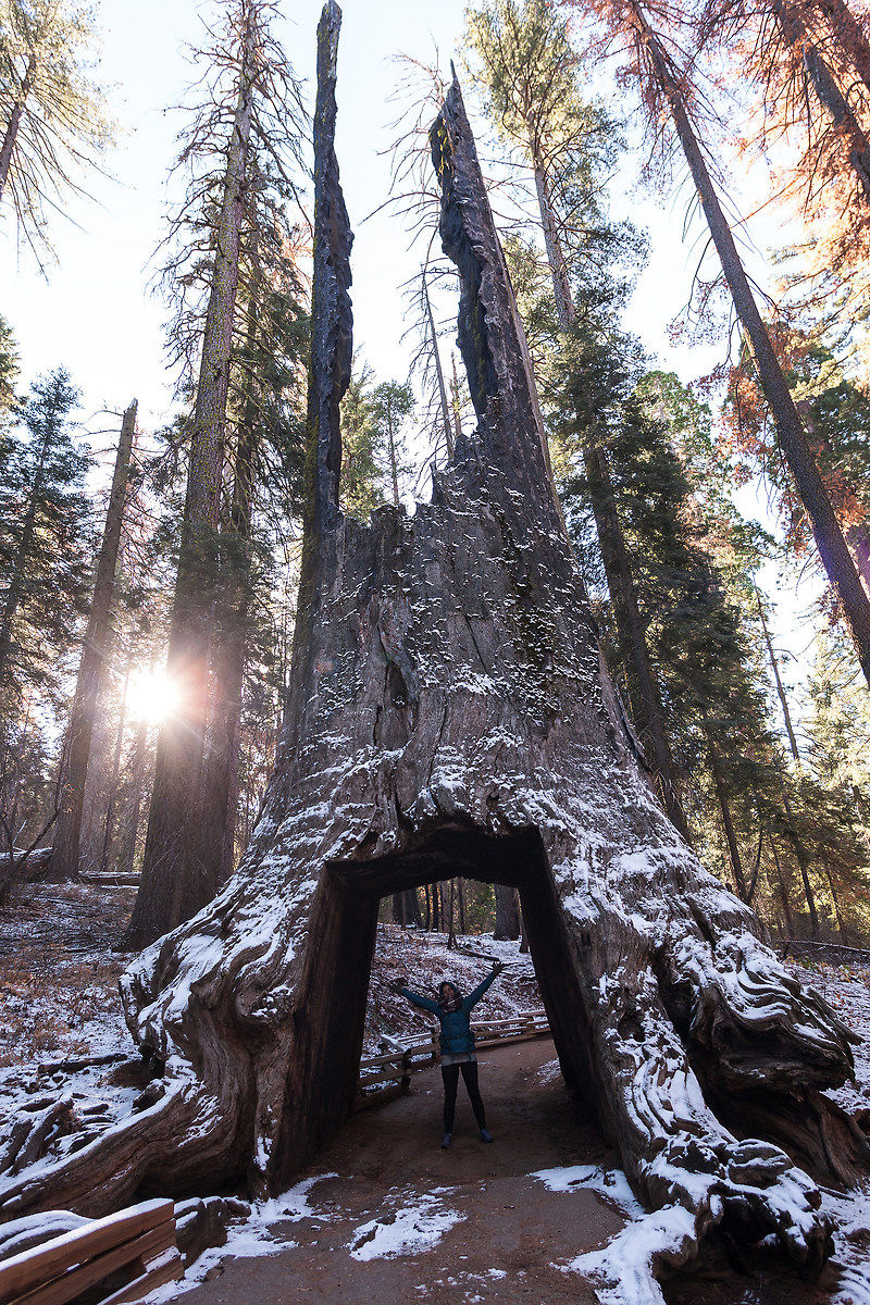Il giorno successivo ci svegliamo e un leggero strato di neve ha coperto alcune zone del parco, abbiamo in programma di andare al Toulumne Grove a vedere le sequoie giganti, è presto e la strada è ghiacciata, ci mettiamo oltre un ora a coprire le 20 miglia che ci separano da quelli enormi alberi rossi. La strada innevata ha però tenuto lontana la gente e ci ritroviamo soli a camminare tra queste immense creature.