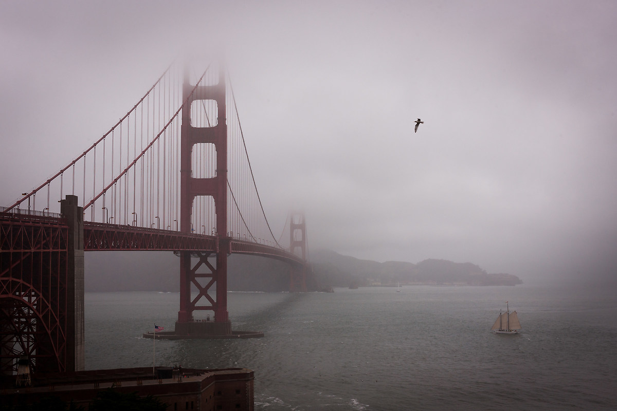 L'ultimo giorno del viaggio inizia (e continuerà) bagnato, una forte pioggia ha trasformato i marciapiedi in pozze e rotto le nostre uova nel paniere. Proviamo lo stesso a visitare il Golden Gate Park, ma senza grossi risultati, riusciamo solo a vedere il Japanese Garden e il conservatorio dei fiori. Non ci rimane che andare all'ultima tappa, l'iconico ponte, il Golden Gate Bridge che, con i suoi 2.7km, è il ponte sospeso a campata unica più grande al mondo. Il clima è avverso, nascondo la macchina fotografica nella giacca per proteggerla, ma è più un'idea visto che sono fradicio anche io. Scatto qualche foto con la macchina che implora pietà gocciolando tra le mie mani. Sono contento però perché con questa nebbia e pioggia, il tutto assume un'aria più affascinante. Non il ho coraggio di lamentarmi alla fine in 15 giorni questa è la prima pioggia che vediamo.