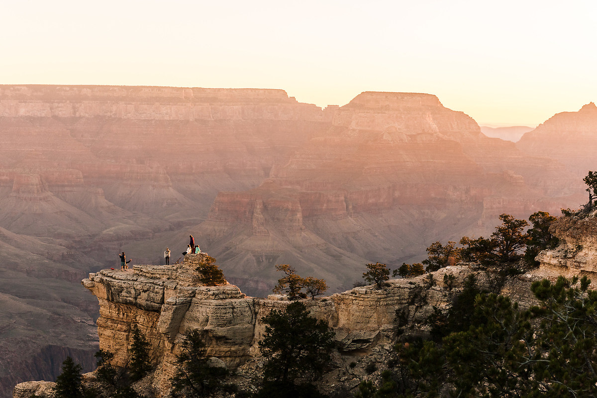 Una cosa che non tutti sanno: il Grand Canyon è in montagna! Stiamo parlando di quota 2200 metri (la sponda nord raggiunge i 2500 con 10 volte la quantità di pioggia e neve di quella sud), quindi a Novembre fa freddo… La nostra prima alba è gelida (-5), ma a dir poco spettacolare, sorprendente la quantità di gente che è presente a godersi questo spettaco.