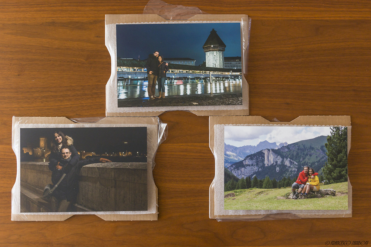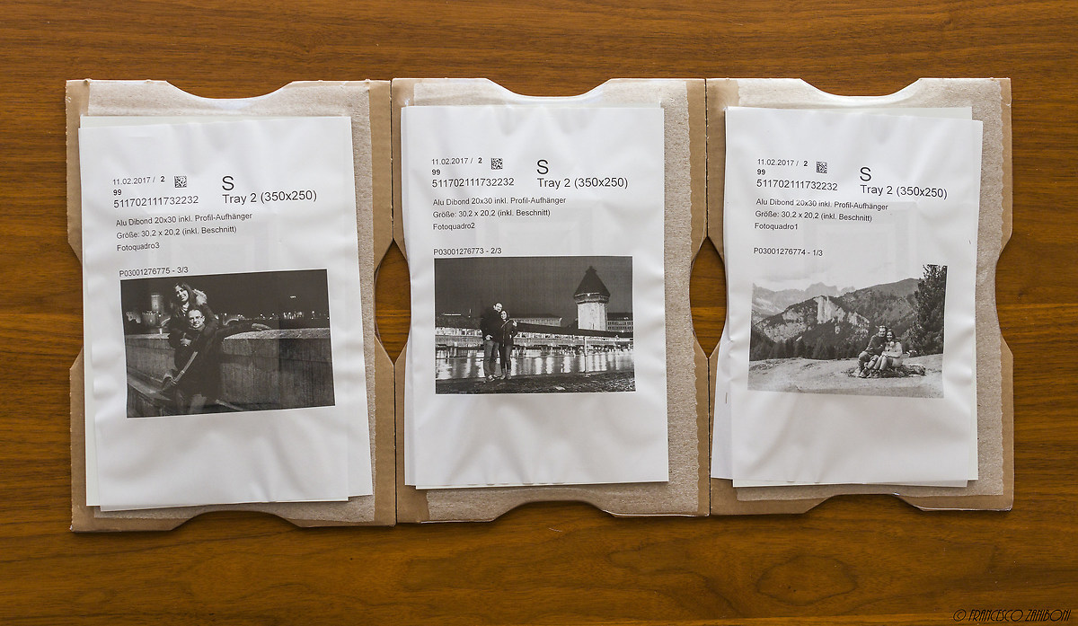 Estratti si nota che sono confezionati singolarmente su delle lastre di cartone, girati a faccia in giù e appoggiati su un foglio di plastica morbida, sopra a ciascuno c'è un foglio con la foto stampata, il nome del file e la dimensione del pannello, tutto quanto sigillato con pellicola trasparente.
