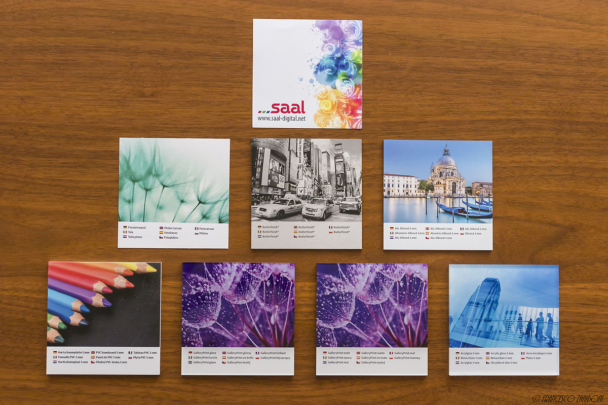 In ogni tavoletta si può leggere il nome del materiale. Da sinistra verso destra e dall'alto in basso abbiamo: Tela, Alluminio Dibond Buttlerfinish, Alluminio Dibond standard, PVC, GalleryPrint Lucida e Opaca, Metacrilato. Dico subito che ho scelto l'Alluminio Dibond standard, ma prima di parlarvi della mia scelta cercherò di descrivere ciascuna opzione, in modo da chiarire, per quanto possibile, di cosa si tratta e di che effetto fornisce. Ciò detto, se deciderete di provare a stampare, vi consiglio in ogni caso sia di leggere le descrizioni che Saal fornisce sul proprio sito sia di ordinare il campionario voi stessi.