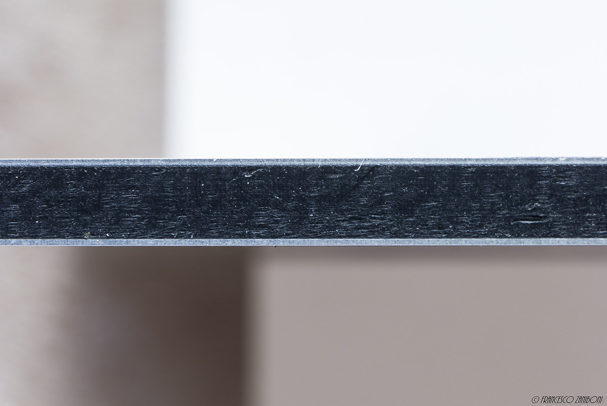 - Alluminio Dibond. La mia scelta. Si tratta di un materiale dal costo medio, non troppo alto ma superiore al più economico di tutti, il PVC. Rispetto a quest'ultimo il peso è più alto, ma anche la qualità di stampa è superiore. Fondamentalmente, per chi non conoscesse questo supporto, si tratta di un sandwich di due fogli di alluminio inframmezzati da uno di polietilene. È robusto e leggero, la finitura opaca. Di seguito trovate una macro del sandwich.