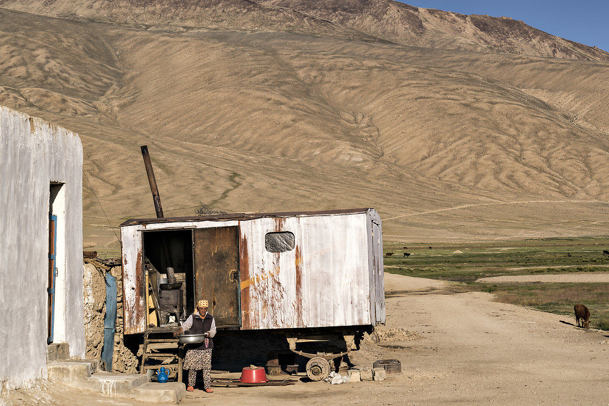 Arriviamo al villaggio di Bulunkul di notte ma questo posto merita qualche foto perché è un posto diverso dagli altri: siamo a 3700m ed il sole cuoce la pelle di bambini ed adulti che sono visivamente tormentati la pelle dalle ustioni, ci sono i residui dell'occupazione Russa ovunque sparpagliati tra le case e la campagna e qualcuno usa un vecchio rimorchio per farci una casa, altri usano i vecchi radiatori per farci degli scalini ed altri ci legano il vitello con la corda affinché non scappi.