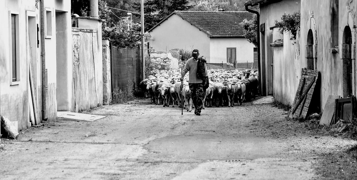 Lungo questa strada che conduce in aperta campagna, avvolta da un silenzio assordante, compare un pastore con il suo gregge, muto e raccolto…