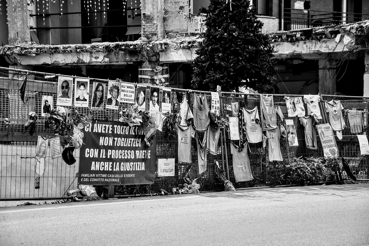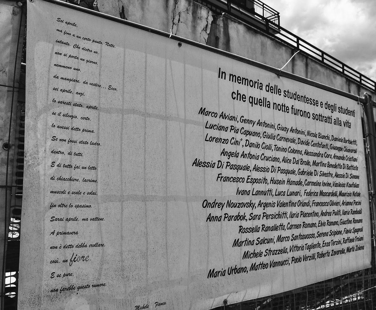 - In memoria delle studentesse e degli studenti che quella notte furono sottratti alla vita - 6 aprile 2009 - L'Aquila 6 aprile 2009, ore 3.32: la terra trema e una violentissima scossa di magnitudo 6.3 devasta L'Aquila e il suo circondario. In pochi secondi la città viene sfregiata: crollano diversi edifici monumentali e civili tra cui la Casa dello Studente (diventata il simbolo del sisma con le sue otto vittime) e la prefettura. Ma i danni sono ingenti dappertutto. Ovunque case dilaniate o venute giù completamente. Il bilancio, alla fine, sarà di 309 vittime, 1.600 feriti, di cui 200 gravissimi, circa 70 mila gli sfollati, di cui 13 mila studenti universitari fuori sede. La frazione est della città, Onna, è rasa completamente al suolo. La macchina dei soccorsi non tarda a mettersi in moto. Molte le persone che vigili del fuoco e protezione civile riescono a estrarre vive dalle macerie: tra queste Marta, 24 anni di Bisenti, studentessa di medicina, viene salvata dopo 23 ore; Eleonora, 21 anni, di Mondaino (Rimini), dopo 42 ore, Maria, 98 anni, di Tempera, viene trovata viva dopo 30 ore. I feriti vengono ricoverati negli ospedali di Avezzano, Pescara, Chieti, Ancona, Roma, Rieti, Foligno e Terni. L'ospedale “San Salvatore” dell'Aquila è gravemente danneggiato dal sisma, e feriti e degenti sono costretti a stare sui lettini e sulle barelle all'esterno dell'edificio, con temperature che scendono anche sotto lo zero di notte. Oltre 35 mila scosse, una media di una scossa ogni due minuti e mezzo vengono registrate dal 6 aprile in poi.