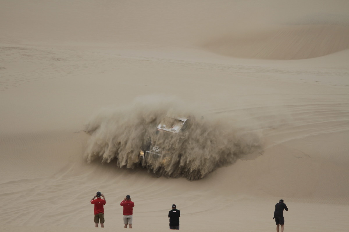 Siamo in una posizione strategica, infatti vediamo un punto dove la duna diventa estremamente ripida e subito prima del rettilineo davanti a noi c'è una curva a 90 gradi. Vedere le macchine immergersi nella sabbia scendendo dalle dune o alzare un muro di sabbia passando la curva in controsterzo fa venire voglia di essere al posto del pilota per "giocare" un po'!