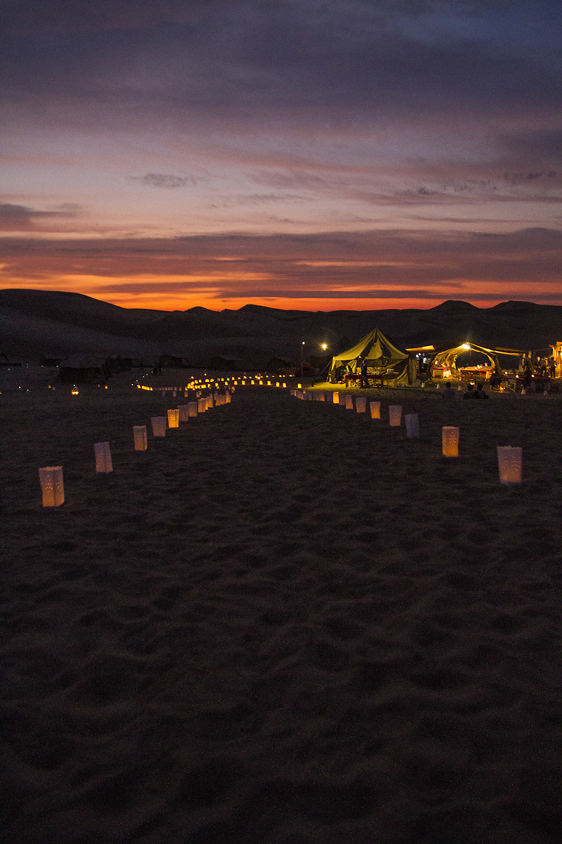 All'arrivo ci troviamo di fronte ad uno spettacolo mozzafiato, il tramonto sulle dune e il camping che è fantastico, è costituito da diverse tende ciascuna con due letti, dei bagni, un tendone per mangiare addobbato a festa e incredibilmente anche le docce.