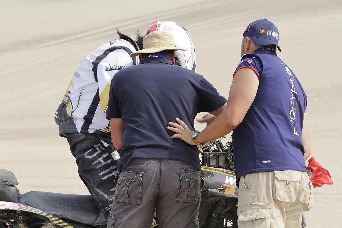 Stamattina il risveglio è stato tranquillo e senza sveglie obbligatorie, anche se il sole ha scaldato le tende molto in fretta e quindi alle 7 eravamo già quasi tutti in piedi. Per le 7:30 circa hanno iniziato a passare i primi concorrenti, mi sono armato della mia 7D e ho iniziato a fotografare il passaggio dei veicoli. Malgrado oggi fossimo nello stesso posto di ieri ci troviamo a circa un centinaio di chilometri dalla partenza della prova odierna e, specialmente per le moto, si riesce a vedere la fatica dei piloti, qualcuno cadeva scendendo dalle dune e faticava a rialzare il mezzo altri invece non trovavano il waypoint e quindi giravano in tondo per trovarlo e attraversarlo.