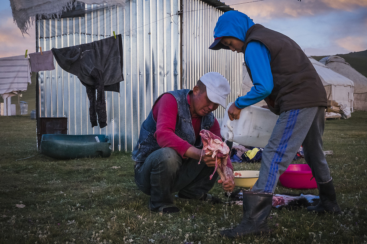 Solamente quando sul prato eravamo rimasti solo noi dell'accampamento, mi sono effettivamente chiesto che fine avesse fatto "l'agnello sacrificale". Mi è bastato controllare dietro la yurta che fungeva da cucina per scoprire che il capo-accampamento stava tagliando e lavando l'animale con l'aiuto del figlio. Il tutto ovviamente rispettando le più rigide regole d'igiene!