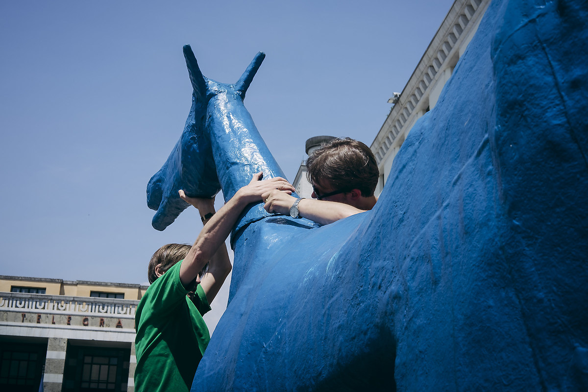 La partenza del corteo era fissata in Piazza Vittoria per le 14. Noi, che in confronto “la metropolitana di Tokyo arriva in ritardo”, eravamo già sul posto circa mezz'ora prima, e tra un “che lente montare?” e “che ISO impostare?” ci siamo ritrovati a scaricare da un furgoncino una scultura gigante di un cavallo azzurro. “Un cavallo gigante? Che c**** centra?”, ho pensato appena ho visto arrivare questo strano equino dalla testa smontata. Dopo aver rivolto questi interrogativi alle simpatiche signore che lo accompagnavano, ho scoperto che questa enorme scultura portava con sé un messaggio incredibile, anzi dei messaggi incredibili! Questi erano stati scritti su piccoli fogliettini inseriti nella pancia dell'animale, o almeno così mi è stato raccontato.