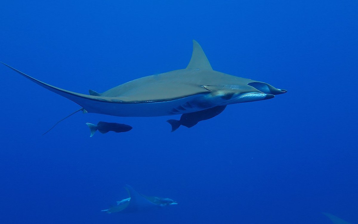 Accompagnata da due remore una mobula mi sfila davanti.