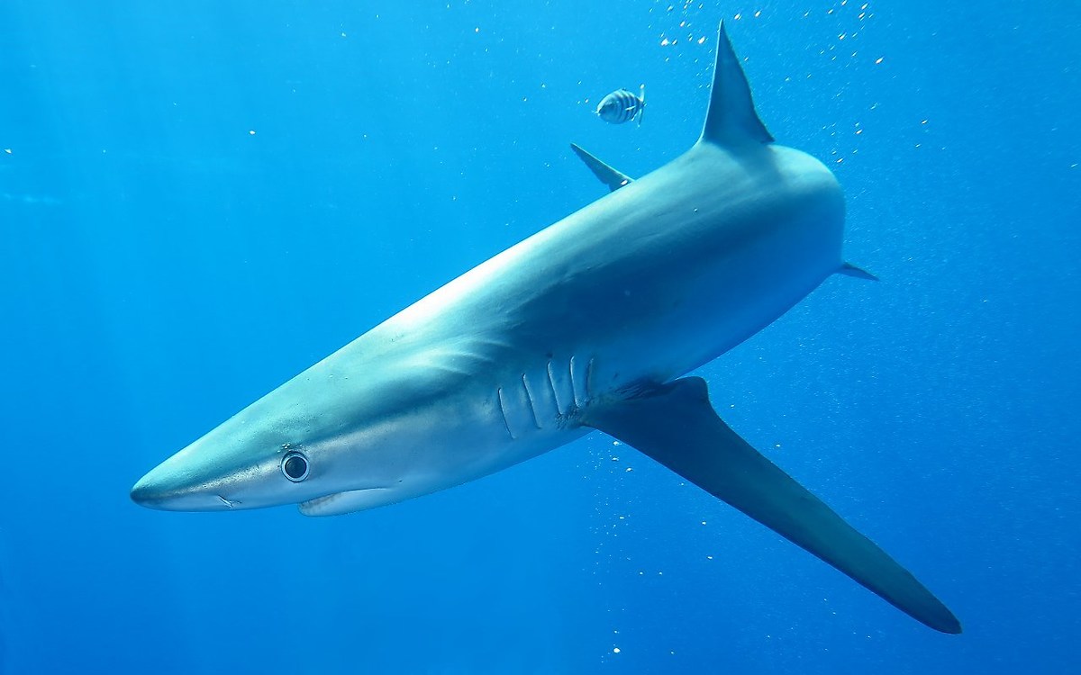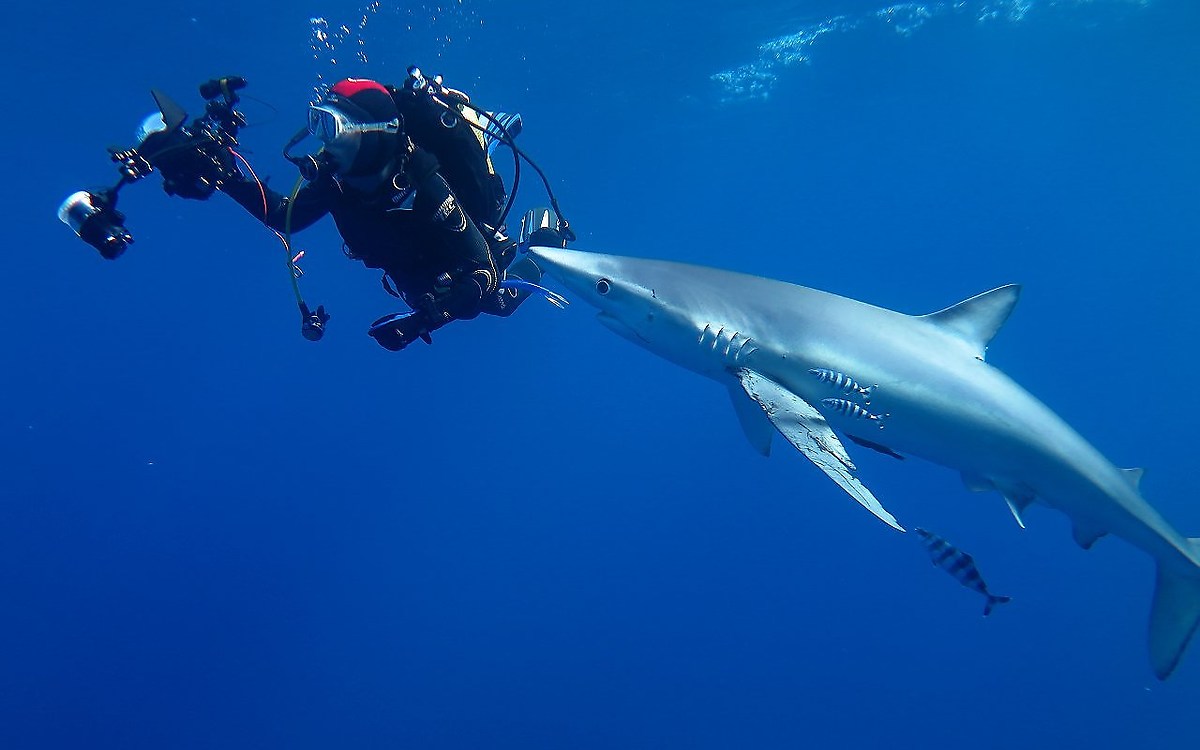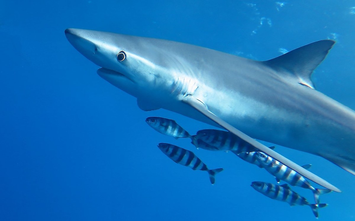 Hanno il corpo affusolato, carrozzerie da Formula 1, e il muso appuntito con coefficienti proprio da Ferrari. Lunghissime pinne ventrali li fanno planare come alianti. Caudale impari col lobo superiore sagittato. L'occhio è curioso e ti fissa implacabile, con l'iride nera che volge verso di te mentre lui ti bordeggia, sicuro della propria imponenza. Sono verdesche, conosciute anche come squali azzurri. Mi sono già immerso con loro in passato e le giudico veramente affascinanti.