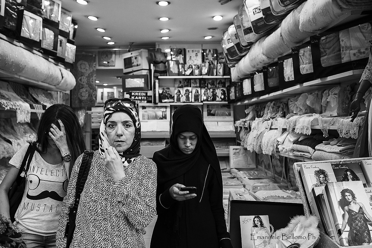 Questa immagine, secondo il mio parere, rappresenta i tre modi di essere della donna turca: la prima a sinistra completamente occidentalizzata, quella in centro ancora legata alla tradizione e quella a destra, integralista, anche se con un cellulare in mano. Per un puro caso le ho colte insieme nello stesso momento, paradossalmente all'ingresso di un negozio di biancheria intima per donne.