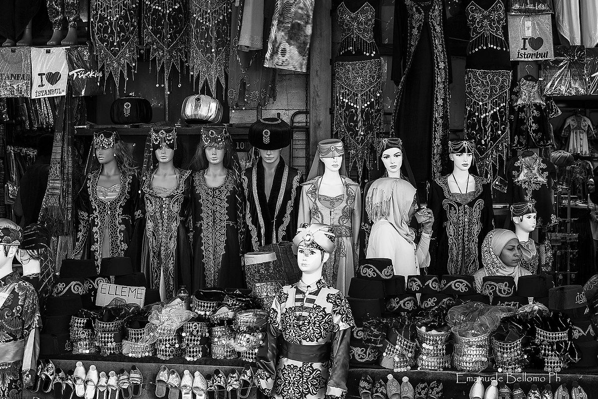 In questa immagine il colore l'avrebbe fatta da padrone ma il bianco e nero rende forse più interessante l'osservazione dei personaggi. Fra i tanti manichini ci sono anche due donne vere!