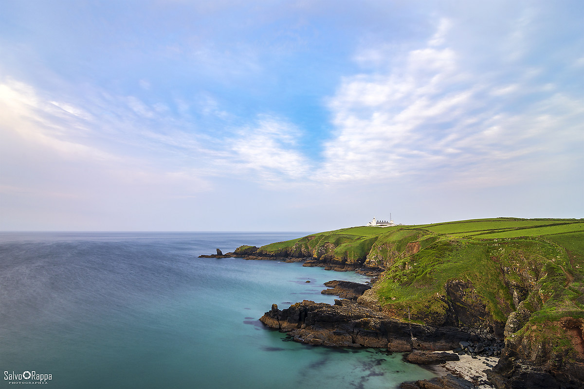 Percorriamo l'intero sentiero sospinti da un leggero venticello fino alla parte opposta della scogliera ed attendiamo ancora un pò. Ormai i colori sono andati, ma a mattinata inoltrata il cielo si libera da quelle nubi e ci regala un bel blu accompagnato da qualche nuvola. La scogliera di un verde magico sulla destra crea un'ottimo contrasto con l'acquamarina del mare graffiata sulla sinistra dalla corrente nettamente visibile in superficie. Il faro (Lizard Lighthouse) in alto a destra sulla scogliera completa la scena.