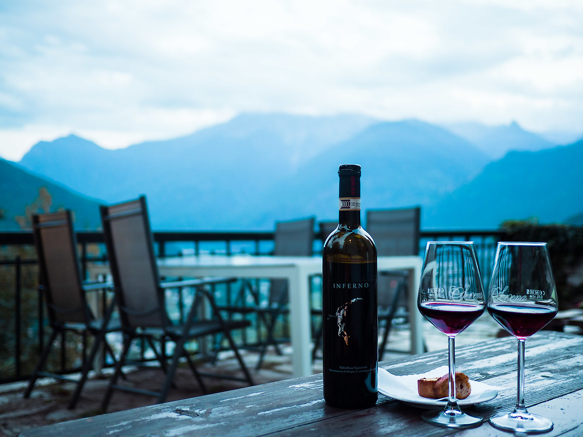 E così, con le orecchie basse e la coda tra le gambe vado a cena, del tutto intenzionato ad annaffiare l'amara sentenza meteorologica con una buona bottiglia di vino. Se non altro il ristorantino collegato al B&B ha una bellissima terrazza, che ci offre un signor panorama sulla città sottostante e tutte le alpi che la circondano.
