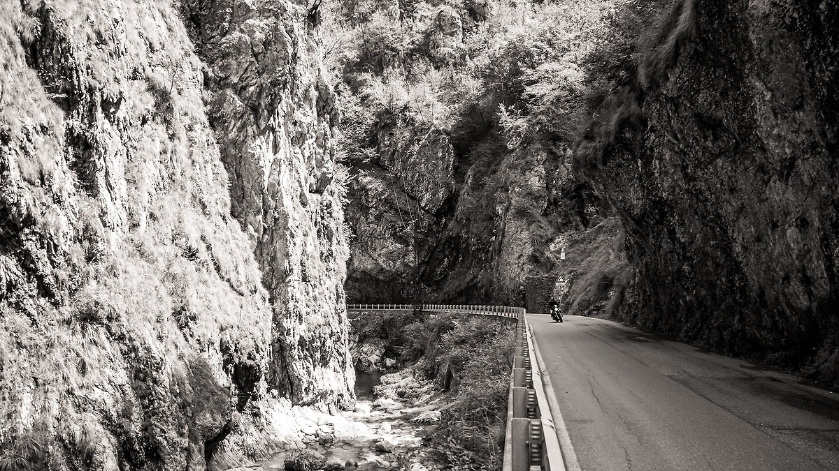 Dopo un paio d'ore ci troviamo nella Val Taleggio, che scorre orizzontalmente alle pendici meridionali del Parco Naturale delle Orobie bergamasche. Qui un'altra meraviglia ci attende: la provinciale si snoda all'interno di una stretta gola, scavata da un anonimo torrentello che in questo periodo dell'anno sembra essere fatto più di sassi che di acqua.
