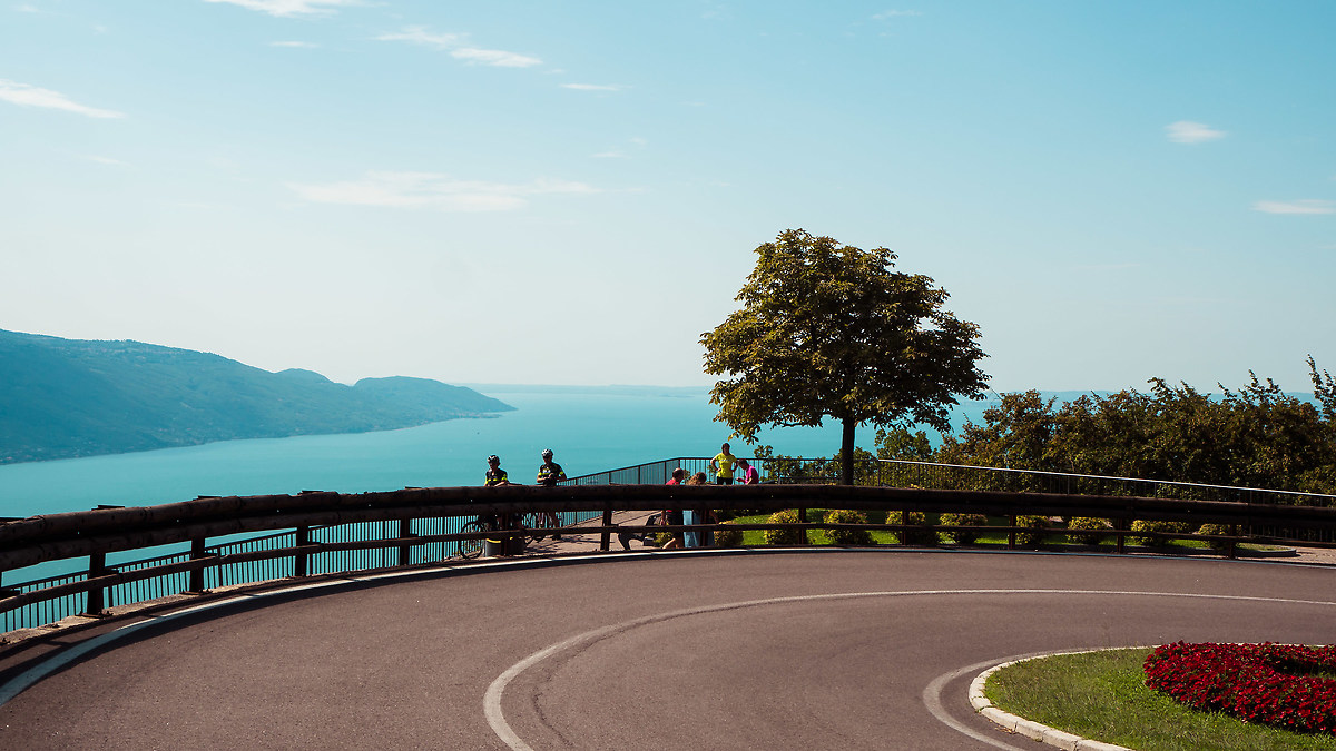 Man mano che saliamo il traffico si diluisce e il panorama ne guadagna: quasi in fondo alla salita c'è un bar, con una terrazza (da brivido) a strapiombo sul lago, quasi una "trattoria al curvone" di fantozziana memoria.