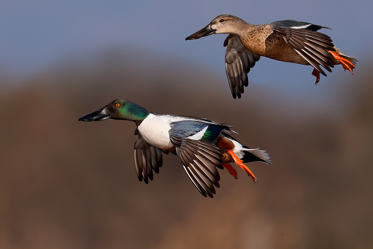 Lontano dagli ambienti antropizzati invece è essenziale un altro genere di mimetismo. In generale intendo per mimetismo un insieme di comportamenti che ci dissimulano da quell'immagine di minaccia armata di fucile che uccelli e mammiferi associano inevitabilmente a un essere che cammina su due gambe e possiede due braccia: una ghillie fogliata è molto utile come anche muoversi con lentezza e, quando ci si avvicina a una posizione sotto lo sguardo dei selvatici, camminare sui tacchi o fingere di zoppicare e di essere fisicamente in difficoltà. Una volta seduto, trovo molto utile scomparire nel paesaggio. Dopo esserci appostati bisogna muoversi poco e sempre con lentezza, soprattutto se siamo stati accettati e i selvatici sono vicino a noi. Ogni regola però ha le sue eccezioni: durante il passo sia in primavera che in autunno gli animali non conoscono in dettaglio le zone dove si trovano perché non le abitano e perciò può essere utile sedersi vicino a un pescatore. Mettersi ostentatamente in vista a godere il tepore del sole può persino incuriosire i nostri soggetti in migrazione. Gli animali sono come noi, e se non hanno avuto un impatto negativo con la presenza dell'uomo, possono anche avvicinarsi a curiosare quando ci vedono. In particolare mi riferisco ai giovani nati da poco e al passo autunnale. D'altra parte però in inverno è opportuno sparire del tutto dalla vista. Talvolta mi è capitato che qualcuno mi sia passato a pochi metri senza riescire a vedermi. Per ottenere questo ho osservato in diverse occasioni che testa, gambe e braccia sono i principali elementi con cui veniamo identificati dagli animali selvatici. Perciò una ghillie fogliata a forma di poncho è ancor più soddisfacente di una tuta mimetica perché cela meglio la presenza dei quattro arti. Ancor più necessario é nascondere la testa con un copricapo che sia ugualmente mimetico, e se si usano occhiali è meglio coprirli con copri occhiali da sole oppure con una sottile retina mimetica. L'autofocus ci aiuterà a portare a casa i nostri scatti, mentre ci preoccuperemo di mantenere nell'inquadratura i nostri soggetti in avvicinamento senza allarmarsi e deviare dalla loro traiettoria. È così che ho ripreso la coppia di mestoloni qui di seguito.