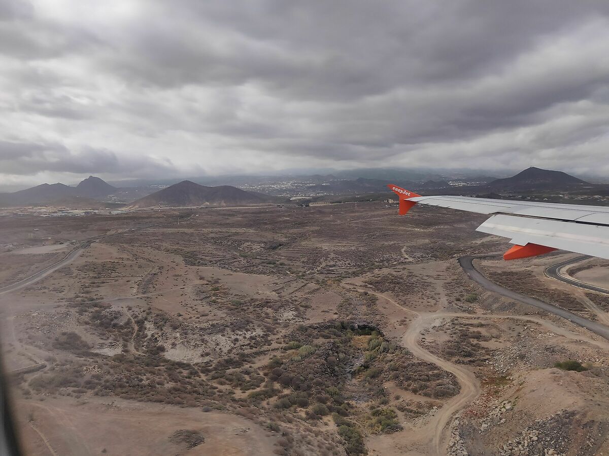 Finalmente il giorno della partenza. Il volo parte alle 14.30, ma noi già alle 11 siamo in aereoporto per evitare sorprese. Malpensa è sorprendentemente vuota, che pacchia. Zero code in qualsiasi tappa dell'aereoporto. Finalmente giunge la fatidica ora X e si parte. Il volo dura 4 ore e mezza, nella parte iniziale se vedono le alpi e la costa francese, complice anche l'euforia per la novità riempio la memoria del cellulare di foto e video che dopo 2 giorni si rivelano inutili e verranno cancellate quasi tutte. Poi un banco di nuvole copre la visuale e ciò indica che è l'ora di dormire. Ci risvegliamo insieme un'ora prima dell'arrivo, quando le nuvole hanno lasciato il posto ad un azzurro senza sosta, tra cielo e mare. Ma tadaaaan, finalmente si vede la prima isola, probabilmente Fuerteventura, poi la seconda, e poi finalmente la nostra. L'aereoporto di Tenerife Sur è proprio sull'oceano e, grazie alle miriadi di foto viste, riconosco anche il profilo di El Medano con la omonima spiaggia. Tuttavia l'impatto con l'isola è particolare: non ci si abitua nonostante la visione delle foto, è un ambiente completamente diverso da come si possa anche solo immaginare, probabilmente sensazione accentuata anche dal fatto che io, ad un vulcano, non mi ci sono mai neanche lontanamente avvicinato, quindi è una novità nella novità.