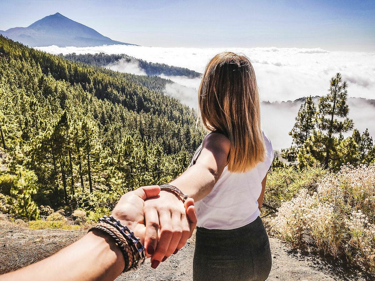 Raggiungere i 2000mslm infatti comporta trovare una escursione termica incredibile, e perciò siamo partiti attrezzati e vestiti ?a cipolla“: usciamo da Santa Cruz che siamo in maglietta, ci fermiamo a fare benzina e darci il cambio alla guida (noi litighiamo per chi deve guidare, siamo una coppia strana) a La Esperanza e l'aria si fa già più freschina al punto da richiedere la felpina. Man mano che si sale si assiste ad un evidente cambio di vegetazione: dal brullo e secco giù a Santa Cruz, al verde delle querce, sostituite poi dalle conifere. Ad un certo punto poi, attraversiamo un banco di nebbia che dopo poche centinaia di metri di strada ci troviamo ai nostri piedi: non era nebbia, sono nuvole. Siamo sopra le nuvole. Ci fermiamo al volo, per scattare delle foto che non rendono giustizia, ma io ed Eli siamo rimasti a bocca aperta dallo spettacolo che ci si para davanti nel primo punto panoramico al quale ci fermiamo, decidendo che sia giunto il momento della foto FOLLOWMETO!