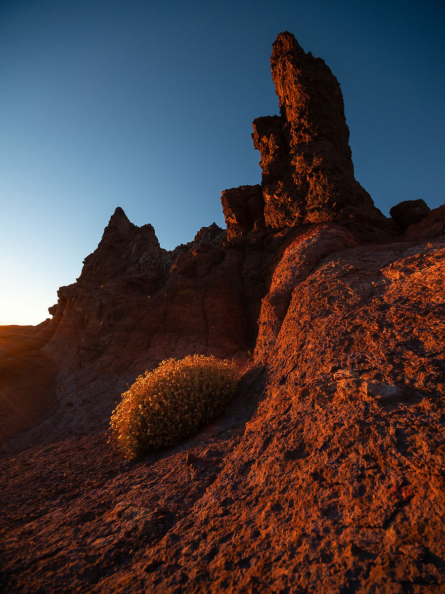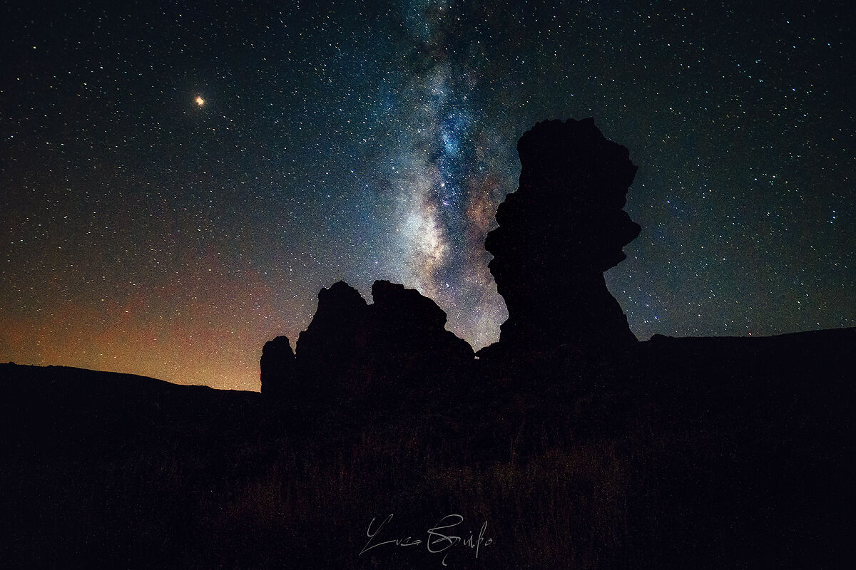 Il sole finalmente tramonta, e la temperatura inizia ad essere rigida, saremo sui 10gradi. Eli decide di iniziare a ritirarsi in macchina, ignara di ciò che le aspetta anche questa sera... io invece continuo a fare scatti ai primi piani approfittando della poca luce rimasta. Decido inoltre di fare l'italiano e di arrampicarmi sulla Roque Chincado, forse la più particolare poichè la base è più piccola dell'apice, e quindi la roccia sembra poter cascare su un lato da un momento all'altro. Di questa roccia ho visto diverse foto dell'amico Mauro Cirigliano perciò decido di emularlo e di avvicinarmici notevolmente. Salire è abbastanza facile, scendere lo sarà sicuramente meno a causa del terreno molto secco, polveroso e pieno di piccoli lapilli. Ma niente paura, sono abituato a ben altro. Mi raggiunge ora Elisa, sono ormai le 9.30, e la temperatura è rigida, siamo sui 4 gradi. Mentre eseguo degli scatti inseguiti della durata di diversi minuti, mi accoccolo alla mia fanciulla. È un atto d'amore si, ma anche ?dovuto“: sta patendo il freddo, e pure un po' di sonno, per starmi vicino e merita di essere coccolata e riscaldata a dovere. Ovviamente la sua resistenza, non enfatizzata dall'entusiasmo e adrenalina che invece mi pervadono, mostra ben presto i limiti, perciò dopo ?poco“ (che significa un'ora a 4 gradi) decide di tornare in auto a riscaldarsi. Ha ragione, povera stella!!