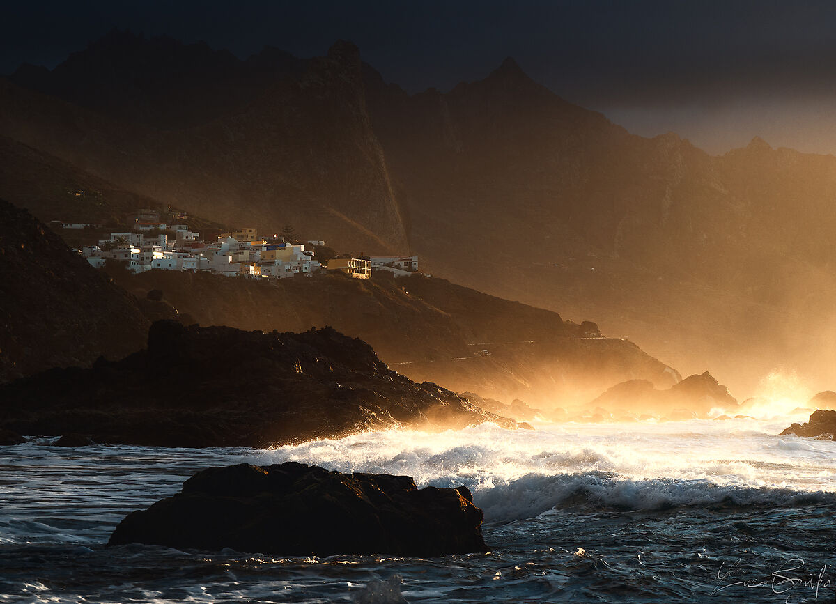 Decidiamo infatti di lasciare la spiaggia prima ancora del tramonto proprio in virtù delle mie previsioni, poi realizzatesi, per tornare a casa con un minimo di luce, che per le strade di Anaga male non fa! Faccio le ultime foto al paese di Anaga con le luci accese e ci infiliamo in auto nuovamente.