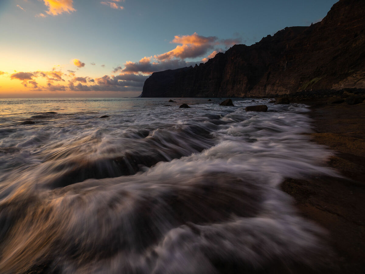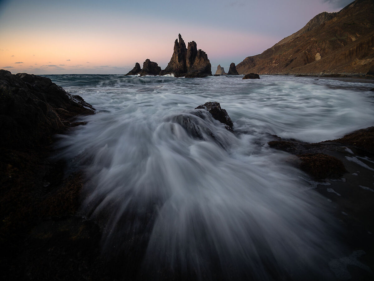 La marea è estremanente bassa e decidiamo subito di tuffarci. Riusciamo ad arrivare a piedi sulla Roque Benijo e, insieme a pochi altri pazzoidi, saliamo e scattiamo qualche foto vanitosa. Pazzoidi perchè le rocce vulcaniche possono essere anche estremamente taglienti o scivolose. La ma la pazzia, quando si parla di fotografare, non ha limiti per me e perciò, dopo aver accompagnato la mia donna in spiaggia, prendo l'attrezzatura e decido di fotografare il moto ondoso dalla Roque, poichè da lì si ha una visione spettacolare anche di Taganana a picco, del Massiccio di Anaga, del sole che si nasconde tra le nuvole per poi far capolino all'improvviso coi suoi raggi laser.