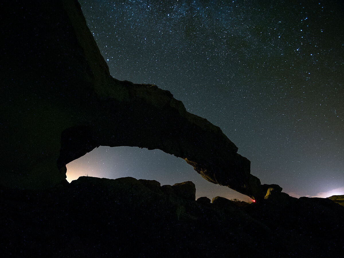 Arrivare all'arco non è facilissimo, specie perché siamo immersi nel buio più buio. Parcheggiamo la macchina e grazie alle torce dei telefoni, di due torce frontali e di un'altra torcia, cerchiamo e troviamo il sentiero che ci porta all'arco. Arco completamente nascosto, non si trova se non si sa cosa si sta cercando, anche perché è un attimo finire a camminare sopra all'arco senza rendersene conto. L'arco è in continua ritirata, la roccia tufacea che lo compone è suscettibile all'erosione e non sono poche le rocce che si trovano ai suoi piedi, distaccatesi da esso. Perciò siamo molto cauti e stiamo a debita distanza dai punti più pericolosi. Anche stavolta piazzo il mio treppiedi, monto l'inseguitore astronomico e inizio a fare qualche foto con Eli ed una torcia con la quale mira alla Via Lattea.