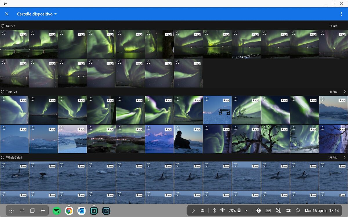 Quando viaggio uso un Surface Pro per archiviare ed editare le foto in viaggio. Non é un fulmine, ma fa il suo lavoro e mi consente di usare tempi morti di viaggio per fare questo lavoro, cosí ottimizzo i tempi e mando le foto pronte direttamente dal treno mentre sto andando a farne altre da un'altra parte (ottimizzare gli itinerari aiuta). Generalmente lavoro su RAW da 48-65MB con C1 e su TIFF da 200-240MB su Affinity Photo. |