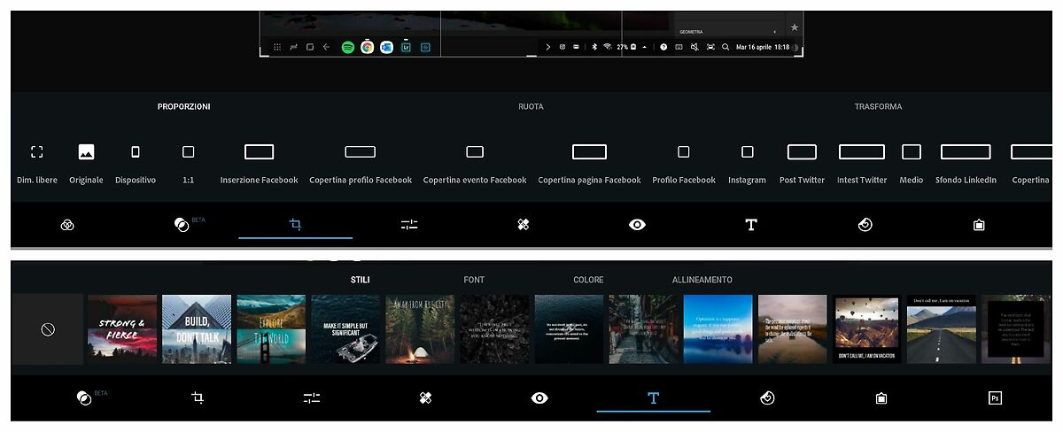 Hanno tuttavia sopperito alla mancanza inserendo la possibilità di ritagliare l'immagine direttamente nel formato social che vogliamo: copertina o evento Facebook, Instagram, ecc. oppure preimpostando dei font da applicare sulla fotografia da condividere online. In Photoshop Express, in fase di esportazione è invece possibile inserire una filigrana personalizzata con il proprio logo e/o nome.