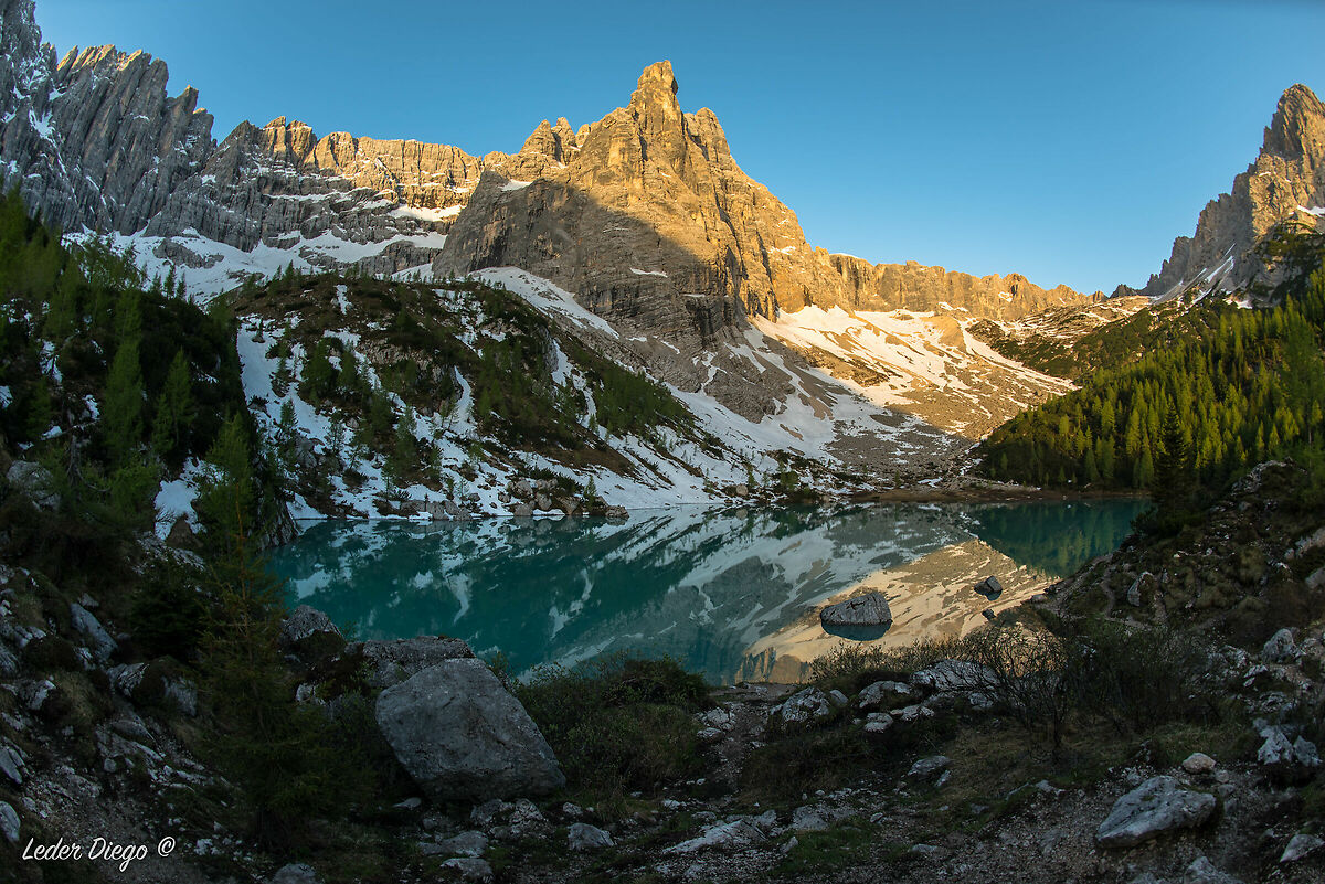 E al suo interno si riflette la cima più alta, che si staglia libera sopra di esso. Il Dito di Dio..nome che più appropriato non poteva essere. Anche pensando alla leggenda che racconta la sua 'formazione', si narra....non sia altro che il Re Sorapiss in persona, pietrificato da un incantesimo nel tentativo di accontentare a dismisura sua figlia Misurina...