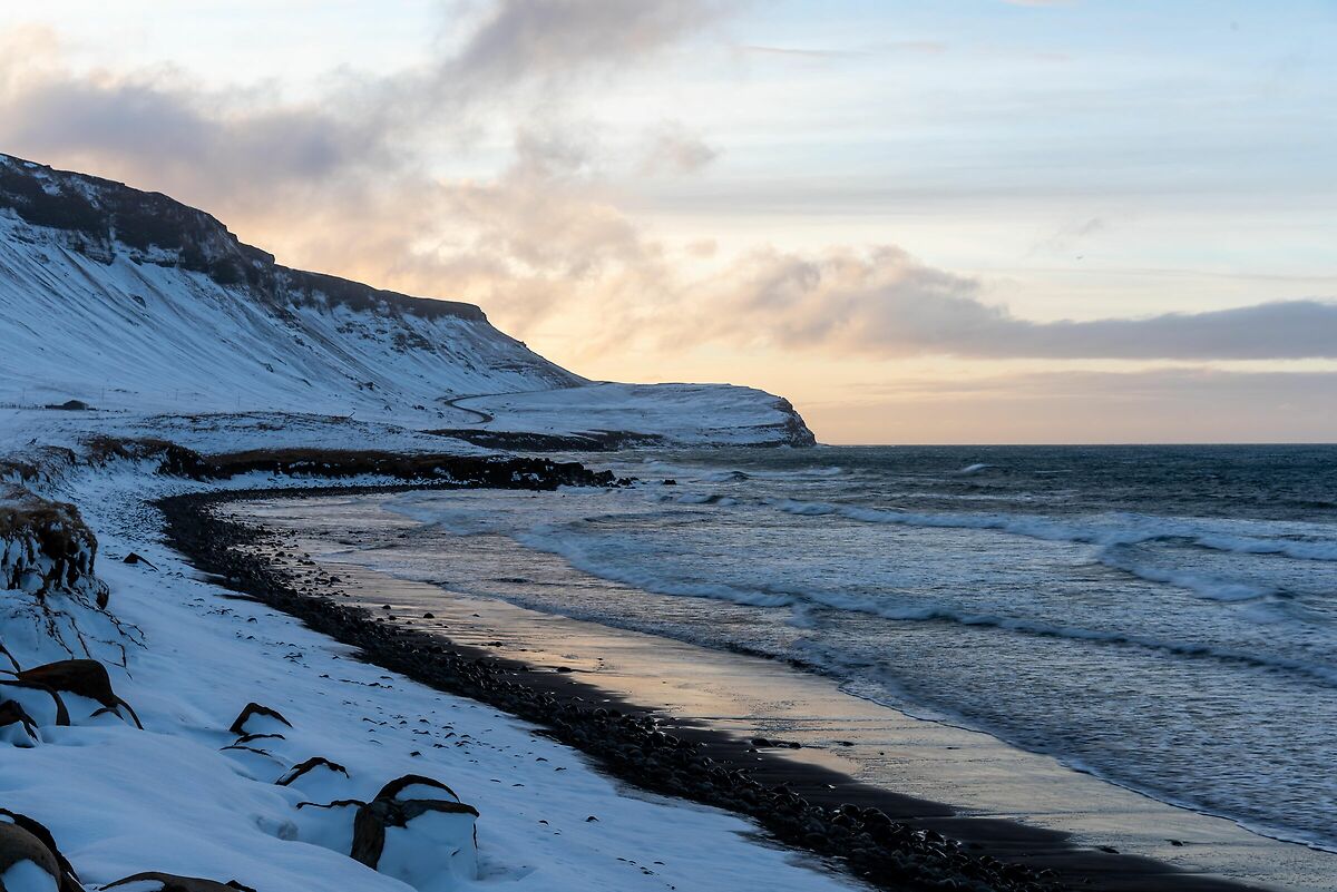 Lungo il tragitto abbiamo già la possibilità di scattare delle foto tra neve, ghiaccio e paesaggi incontaminati ma appena ci sistemiamo in alloggio, dopo aver parlato con il padrone di casa che ci ha consigliato cosa vedere nei dintorni (islandesi generalmente tutti super disponibili ad aiutare e con un inglese fluente!) ci muoviamo per cogliere il primo tramonto d'Islanda. Alla sera, niente aurora….nevicata serale e tutto coperto!