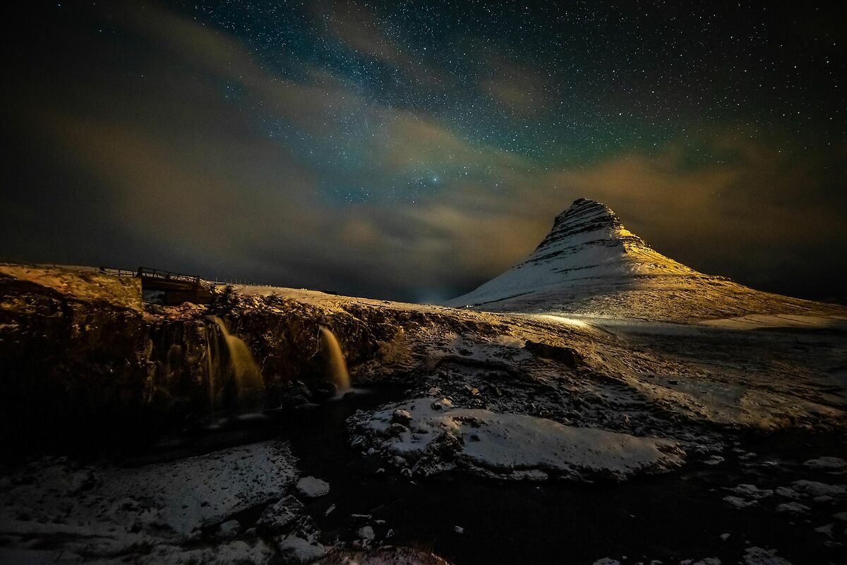 Proseguendo il giro ci siamo fermati a Londrangar, dove abbiamo ammirato un paesaggio e una vista pazzesca con delle scogliere uniche a picco sul mare. È semplice da raggiungere: lasciate la macchina al parcheggio, al lato della strada e seguite il percorso apposito e dopo alcuni metri a piedi, arriverete in cima ad una collinetta. Leggermente più in basso, troverete il look out dove potrete ammirare il paesaggio. Abbiamo concluso il giro tornando a Grundarfjörður tramite la strada 54, un passo di montagna completamente ghiacciato! Dopo cena, speranzosi di vedere la nostra prima aurora usciamo ma veniamo colti da una bufera di neve che va e viene… ma non demordiamo e appena la bufera si calma ci appostiamo per la foto di rito del monte e intravediamo tra le nuvole i primi colori caratteristici di questo fenomeno pazzesco, anche se per oggi si tratta solo di sfumature essendo il cielo molto nuvoloso!