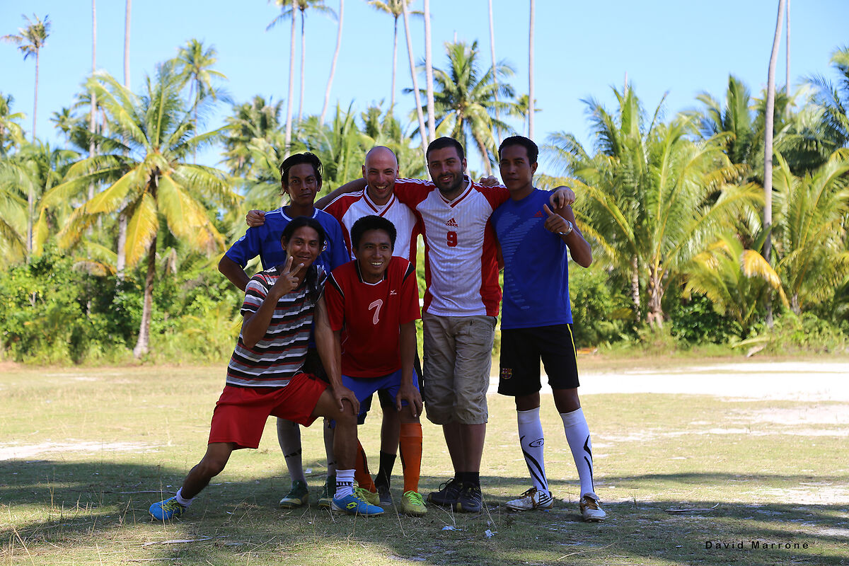 Io e Macca ci dividiamo dal resto del gruppo. Affittiamo due biciclette e decidiamo di raggiungere Bohesilian e conoscere finalmente le famose collinette con tanto di spiriti Al primo strappo stile Mortirolo (chiamale collinette) malediciamo sette sfere Arriviamo a destinazione letteralmente mani e piedi dopo diverse centinaia di foto e pedalate. Siamo stanchi, sudati, dispiaciuti per non aver visto gli spiriti e senza possibilità alcuna di pranzare. Decidiamo quindi di trovare qualcuno che con un mezzo ci riporti indietro. Lo troviamo piuttosto facilmente e in men che non si dica siamo nella nostra camera del nostro Home stay. Mi spoglio, esausto, con la sola voglia di dormire un po'. Macca invece esce un attimo e subito rientra. Ha dalla sua una proposta che secondo lui non posso rifiutare: una partita a undici all'equatore alle tre del pomeriggio. Dopo una mattinata in bici e venti giorni di stenti e privazioni. Uno sguardo, qualche parola, e alla fine ci ritroviamo nel campo da calcio. Volevamo scarpini e pantaloncini e ci hanno dato solo una maglietta tarocca della nazionale indonesiana. C'è il pubblico, la telecronaca e una musica beffarda che dice “we are young”. E poi c'è un arbitro di nostra conoscenza: Settesfere. Capiamo che è un torneo a 4 squadre (forse i villaggi dell'isola?) e indoviniamo che la nostra è la più scarsa. Forse perché invece di riscaldarsi qualcuno fuma o forse perché siamo l'unica squadra con le magliette tutte diverse. Se non abbiamo visto gli spiriti prima, beh, forse ora è arrivato il momento giusto per conoscerli…