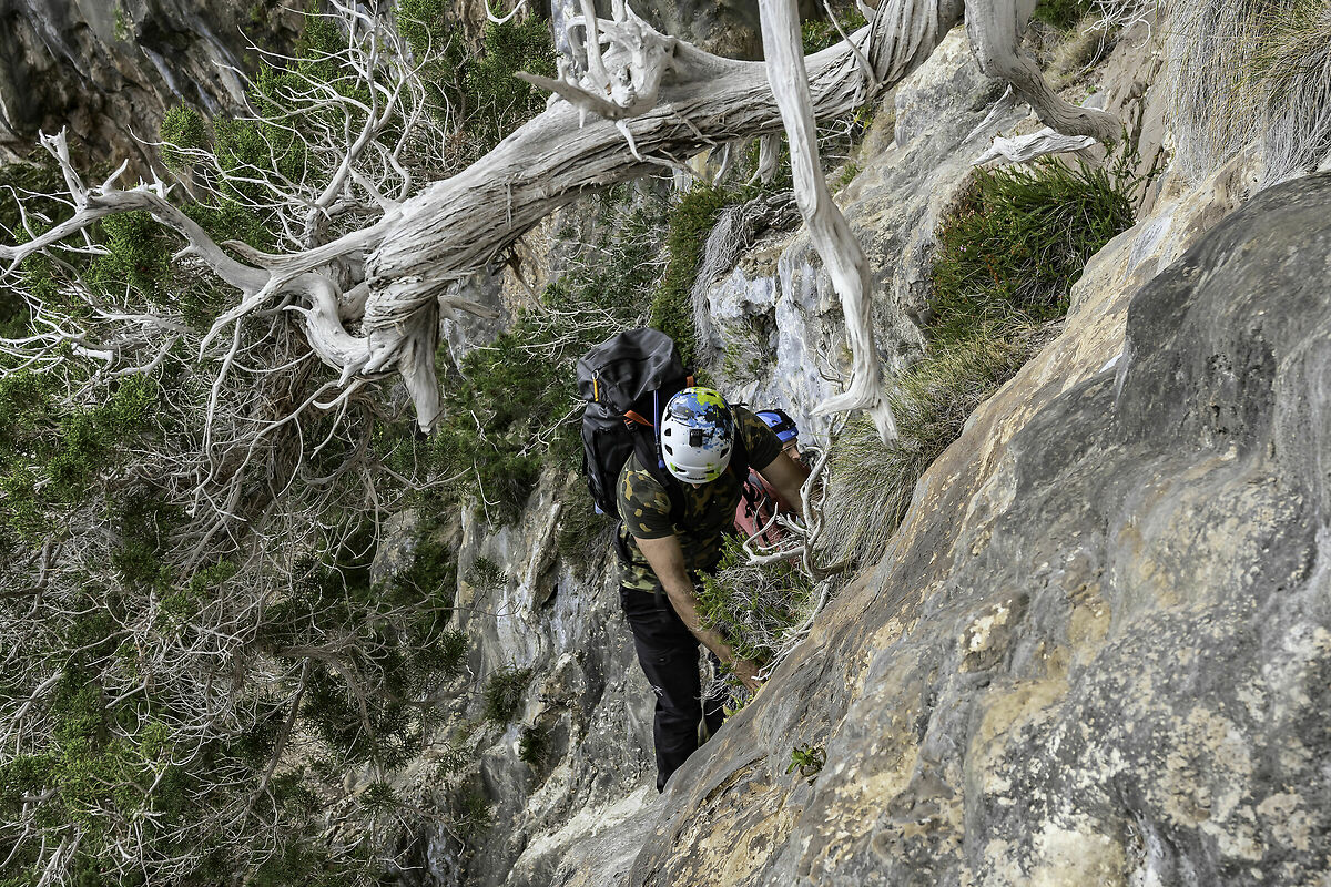 Una parete verticale è superabile proprio montando su un ramo di ginepro che penzola nel vuoto. Il nostro amico meno avvezzo all'arrampicata mi vede salirci sopra e fa : " ma che, devo salire li ?" Ed io "SI" e lui "Oh Cazzo !" In effetti il flessuoso ramo è solido ma dondolarci sopra fa un certo effetto.
