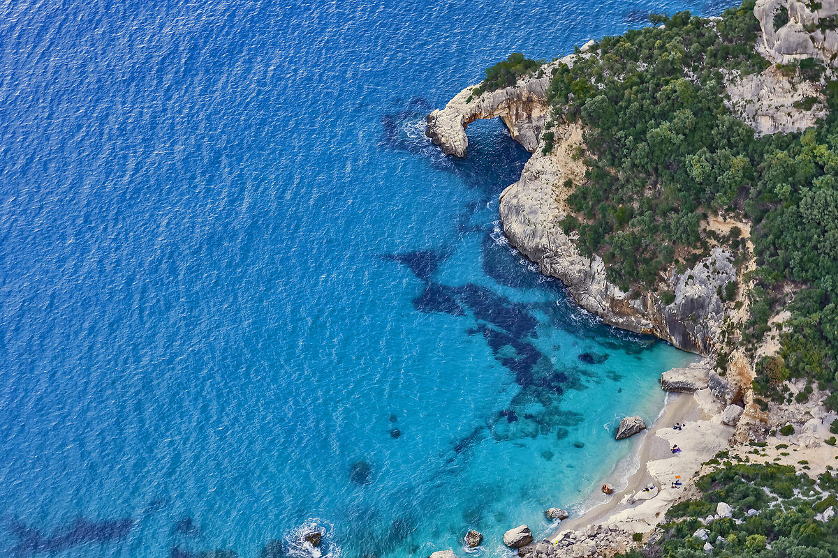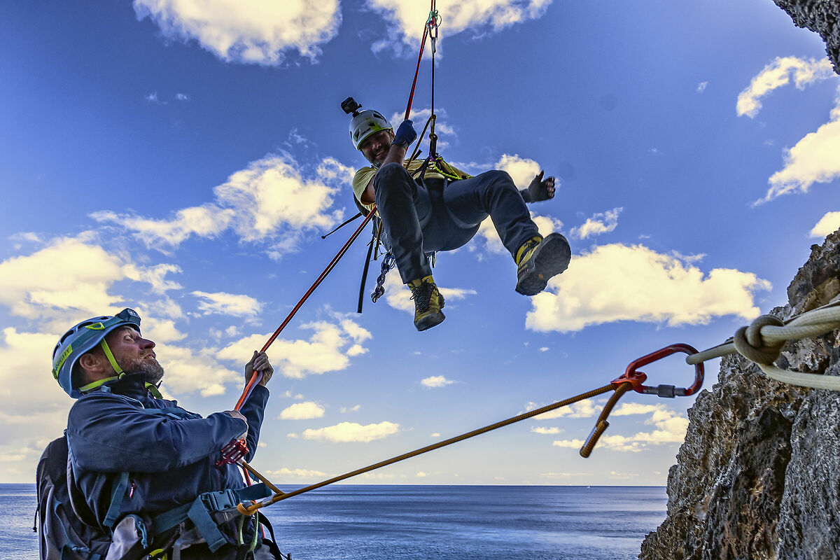 A questo punto, con una doppia di 10 metri, siamo di nuovo sul sentiero del Selvaggio Blu e si passa dentro un arco di roccia dove, al solito immancabile, solido e sicuro ginepro, si arma una doppia di 25 metri a picco sul mare. Di nuovo si entra in una grotta stretta che poco dopo diventa un enorme anfiteatro con un arco al centro.