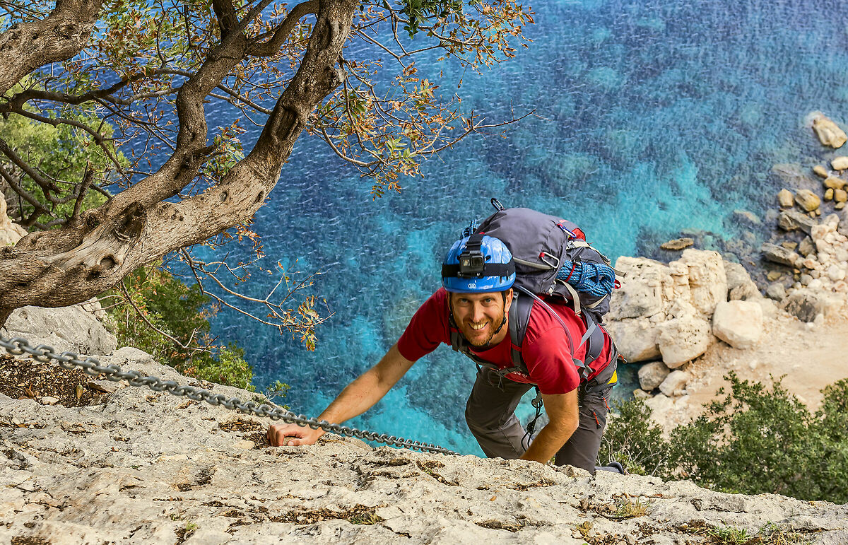 Si passa dentro l'arco e poi con un tratto attrezzato a ferrata si arriva ad una fessura di conglomerato che porta sugli scogli a toccare il mare. Da li dobbiamo risalire tutto il dislivello sceso e arrampicando per circa 100 metri con difficoltà di III max. IV grado su conglomerato (Il conglomerato sembra un mucchio instabile di sassi pronti a franare appena li guardi ma in realtà sono solidissimi ancor più essendo cementati dal mare nei millenni. Solo che fa schifo a guardarlo) fino a raggiungere il filo di cresta utilizzando anche i ginepri come moderni Tarzan.