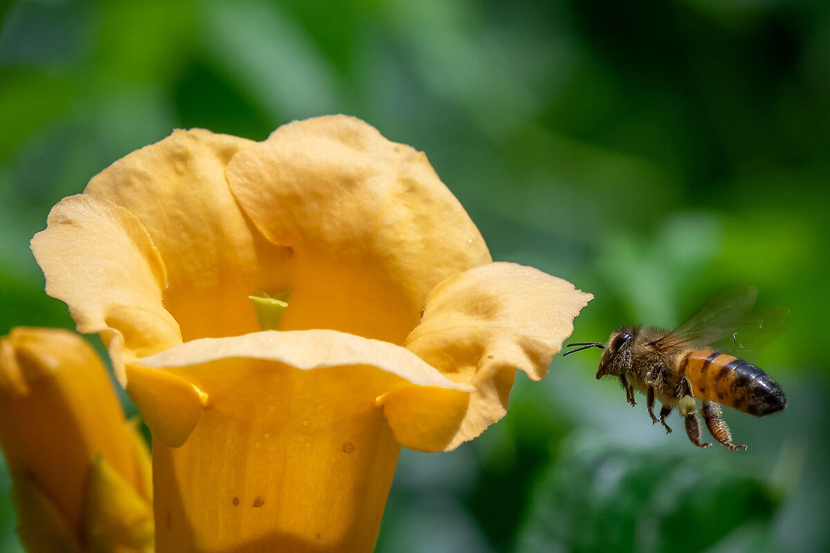 (Ape domestica in volo di approccio su Bignonia Campsis radicans flava. Scatto eseguito su treppiede con Olympus OM-D E-M1, Tamron SP 180mm (360mm. eq.) f/3.5 Di LD Macro montato con adattatore AI-M4/3, fuoco manuale e controllo remoto Neewer RST7001, 1/2000 f/3.5, ISO 800).