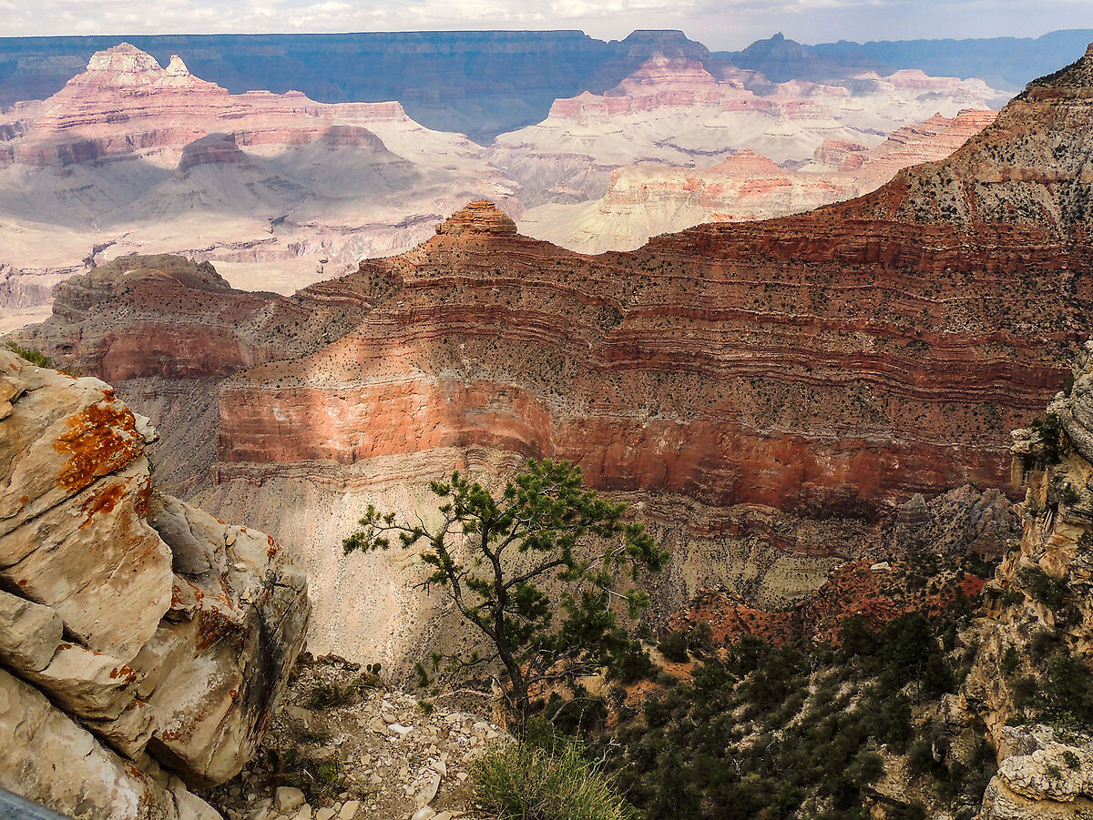 Mattinata molto ventosa e a volte anche fredda, (siamo passati dai 43 gradi di PAGE ai 20 gradi del GRAND CANYON), dedicata percorrendo la LINEA ROSSA fino al capolinea HERMIT'S REST, la maggior parte del tragitto sfruttando le navette, con alcuni tratti fatti a piedi, peccato per una leggera foschia in cielo che ci sta accompagnando fin dal nostro arrivo e che disturba le fotografie.