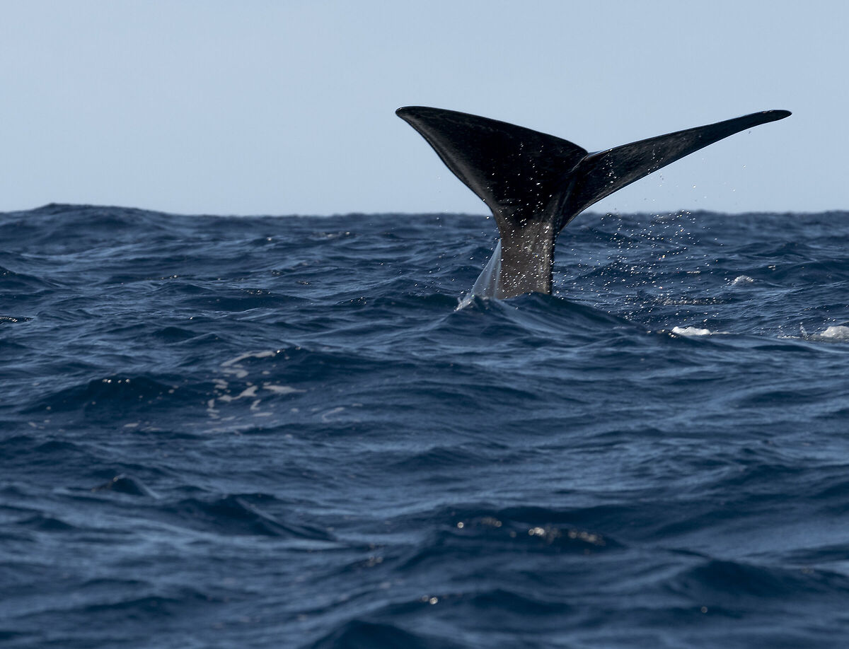 Ed eccole! per prima vediamo una coppia di capidogli, mamma e cucciolo, poi dei delfini che giocano tra le onde ed infine altri capidogli fino a quando uno ci regala l'amata immersione; il capodoglio prende fiato immergendosi praticamente in verticale per andare in cerca di cibo, in questo modo la coda esce fuori dal mare.