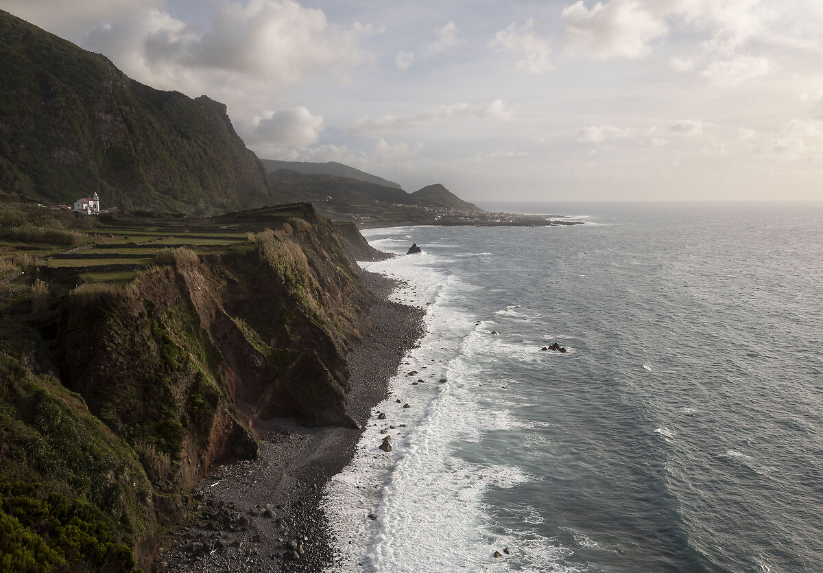 L'ultimo giorno visto sia il tempo incerto sia la nostra attrezzatura non del tutto consona ad una scalata impegnativa come il monte Pico decidiamo purtroppo di rinunciare alla salita e optiamo per fare un periplo dell'isola. Al mattino ci dirigiamo ad est, dove sulla costa nera molto frammentata che i nativi chiamano “biscoitos” sorge il Farol da Ponta da Ilha. Facciamo parte del percorso accompagnati da un gatto molto amichevole che si siede sulle mie gambe mentre faccio alcune foto e da un cane che fa da guardia al micetto “San Francesco, spostati”.
