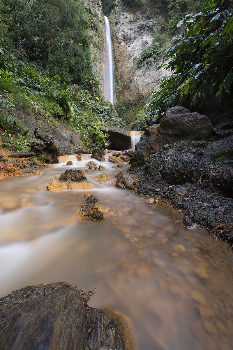 La prima giornata su quest'isola è accompagnata da una forte pioggia che però non ci fa dubitare e quindi partiamo come previsto per la valle das Lombadas che si trova al centro dell'isola. Qui troviamo una fabbrica abbandonata e un fiume dal color arancione che con la vegetazione verde forma un contrasto di colori davvero affascinante. Il fatto che piova e che il tutto sia più scivoloso rende la passeggiata ancora più bella e infatti presi dall'avventura, oltrepassiamo un paio di auto con i turisti riparati all'interno e ci inoltriamo alla ricerca di una famigerata cascata che si dovrebbe trovare nei pressi ma che non è segnalata. Percorriamo diversi sentieri nel bosco, spesso tornando sui nostri passi per scegliere un'altra direzione dall'ultimo bivio, il tutto circondati da una fitta vegetazione e sempre sotto una pioggia battente che rende l'avventura ancor più affascinante: ci sentiamo come degli (incoscienti) esploratori. Purtroppo, non troviamo la cascata, ma torniamo alla macchina col morale alto: l'emozione dell'avventura nella pioggia è stata una ricompensa più che sufficiente.