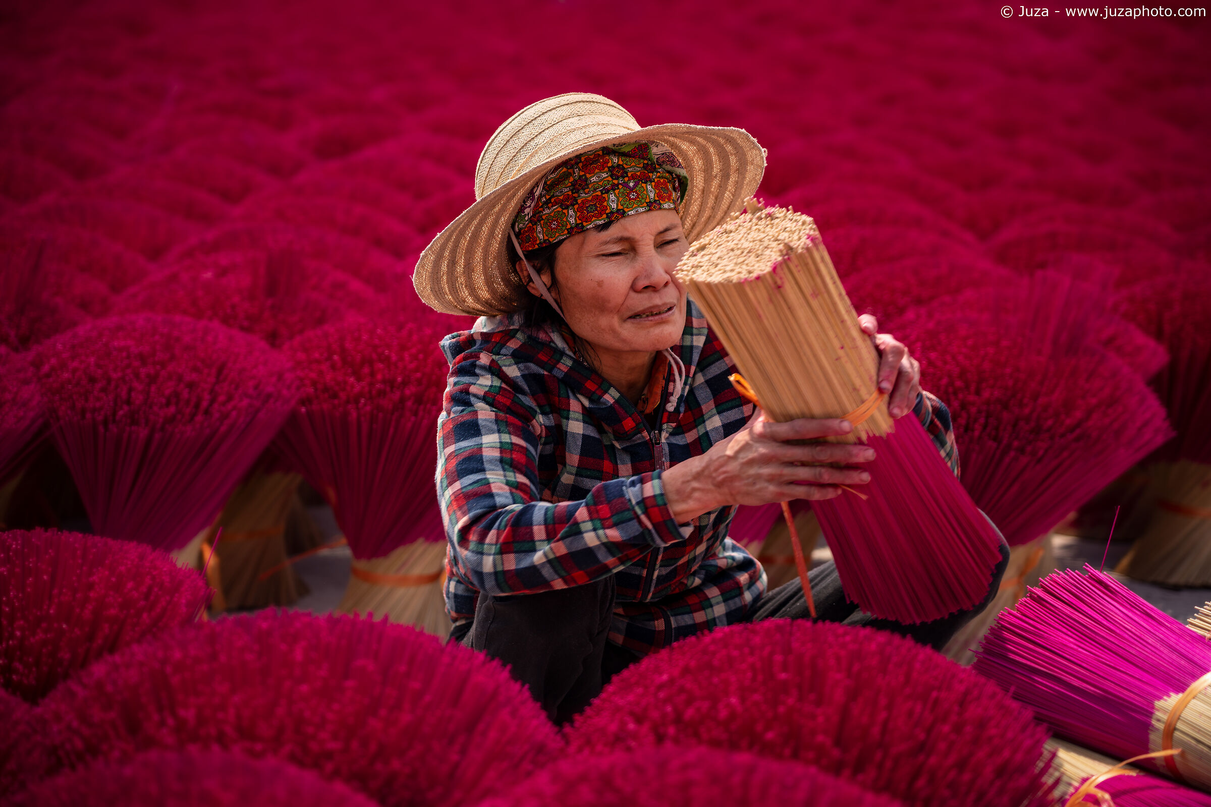 Gli artigiani preparano l'incenso in grandi pentole, miscelandolo con una tinta rossa (o, più raramente, altri colori); i bastoncini di circa 30 centimetri di lunghezza, già legati in grandi fasci (come poi li vedremo esposti) vengono rapidamente immersi nel liquido per metà della loro lunghezza. Ogni fascio misura circa 35-40 centimetri e ha un peso attorno ai 4-5kg. Dopo pochi secondi, vengono scrollati per rimuovere il liquido in eccesso e disposti in grandi cataste, per poi essere trasportati in qualsiasi spazio che si presti all'essicazione - cortili privati, marciapiedi, spazi vari ai lati della strada, piazze. I lavoratori hanno imparato a disporli in modo che il fascio si apra a forma di fiore in modo da ottimizzare l'asciugatura, e questo va a creare lo spettacolo che potete vedere nelle foto.
